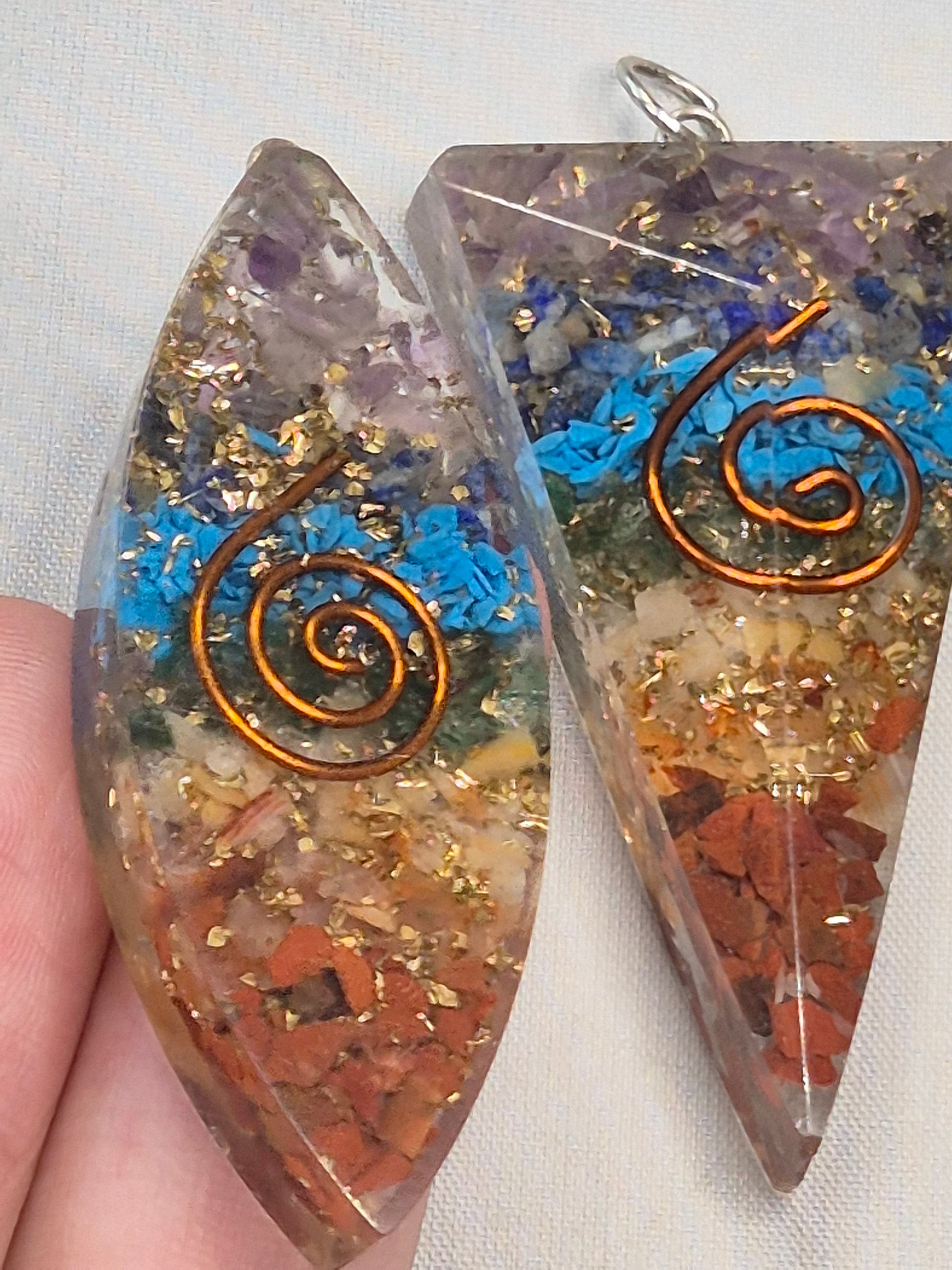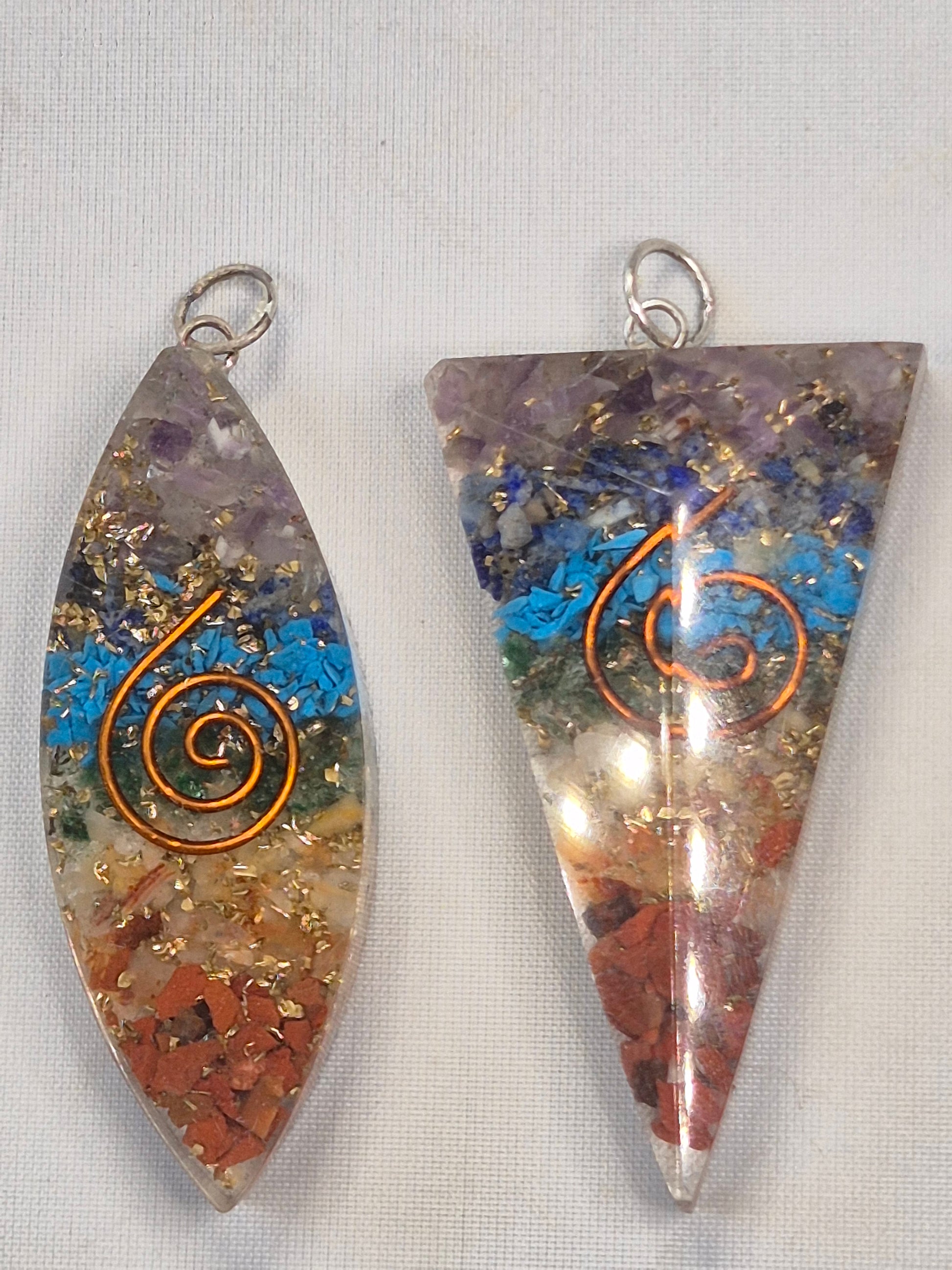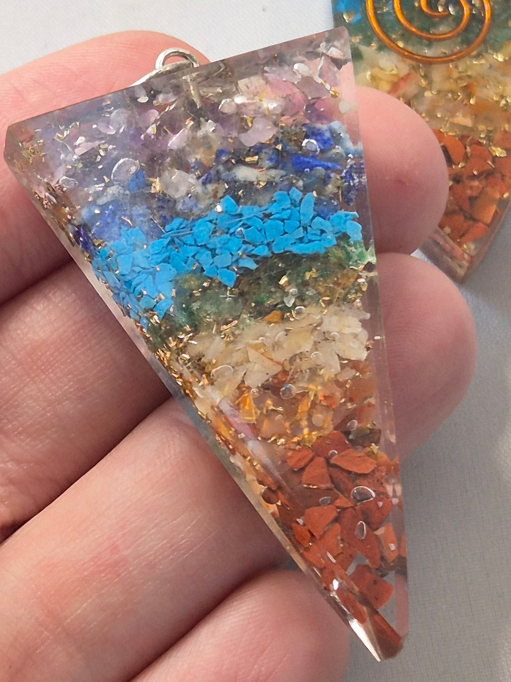Wunderschöne hochglänzende Orgonit Anhänger mit 7 verschiedenen Chakra Edelsteinen sowie mit Blattgold & Kupferspirale.