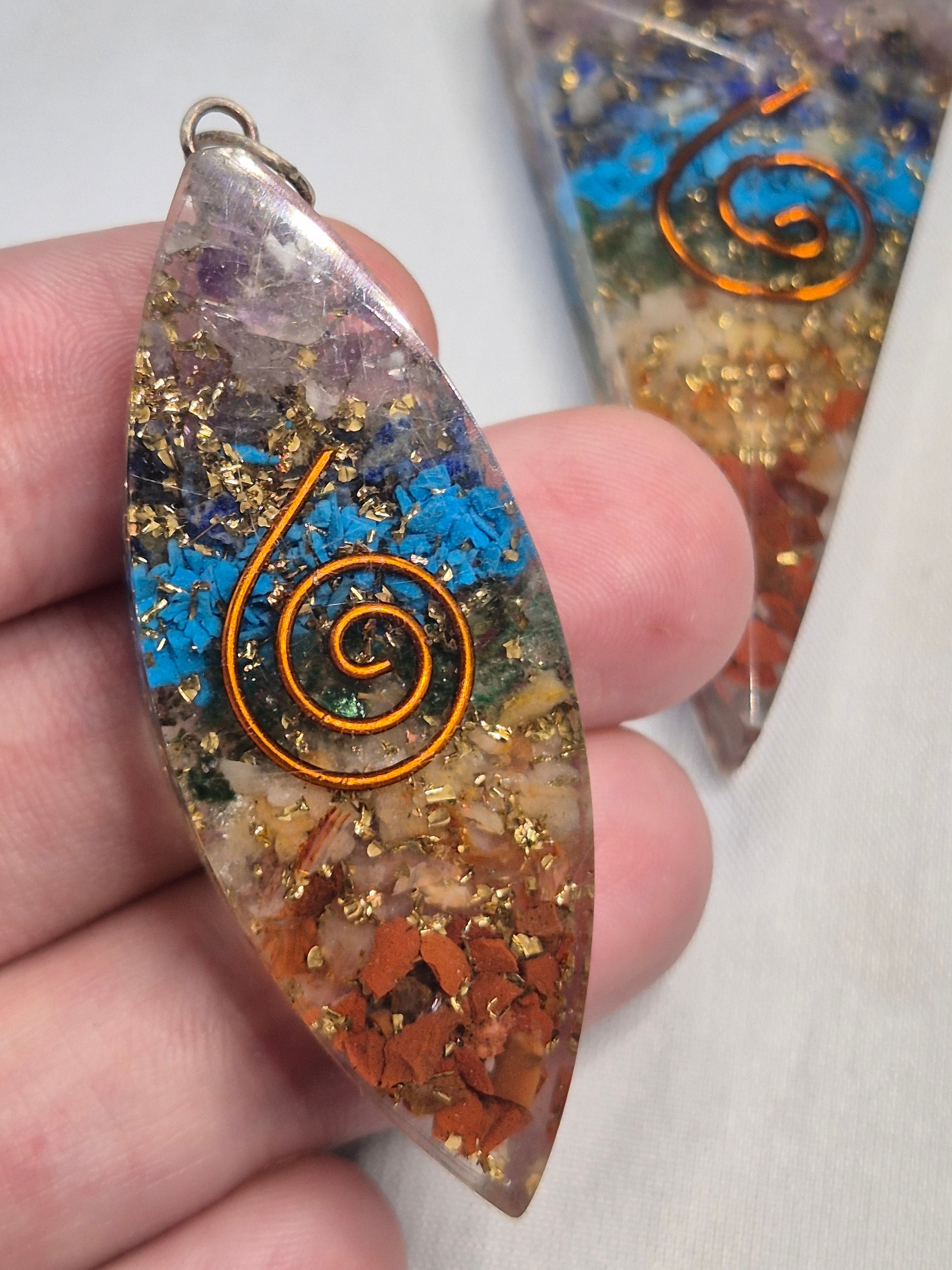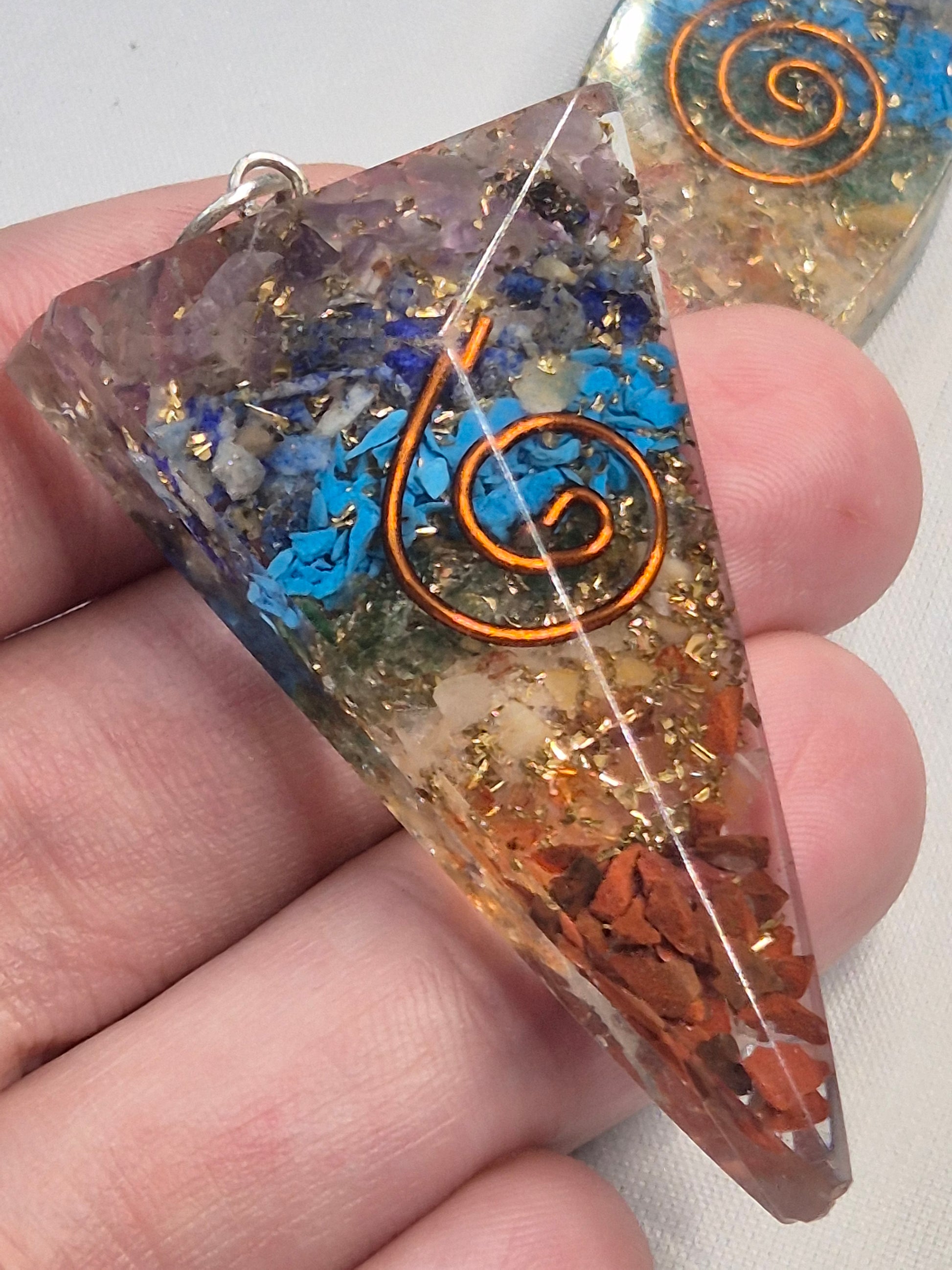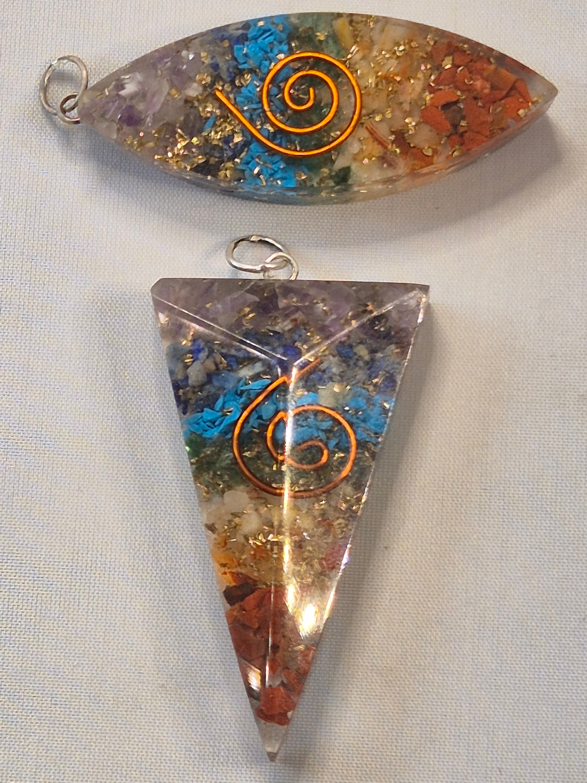 Wunderschöne hochglänzende Orgonit Anhänger mit 7 verschiedenen Chakra Edelsteinen sowie mit Blattgold & Kupferspirale.