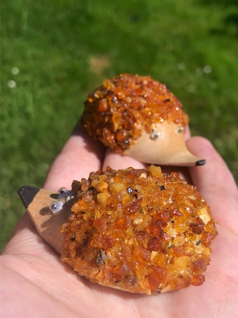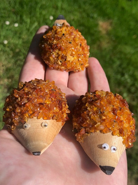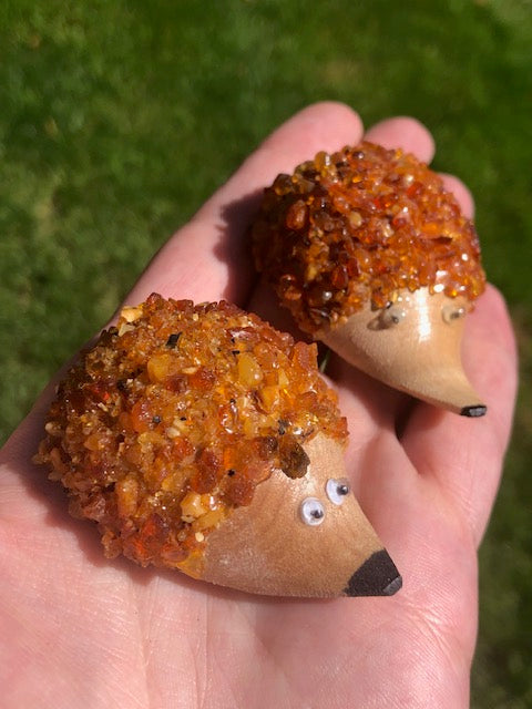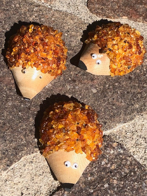Sehr schöne aus Holz handgefertigte Igelfigur, mit Stacheln aus geschliffenen Bernsteinen in bester Qualität.