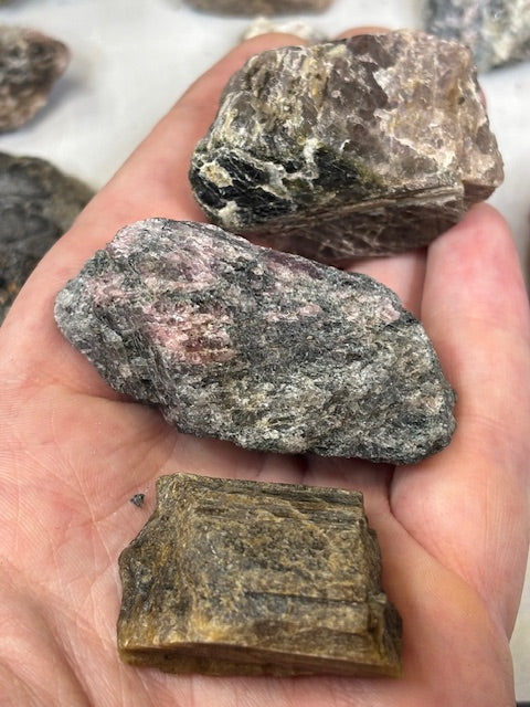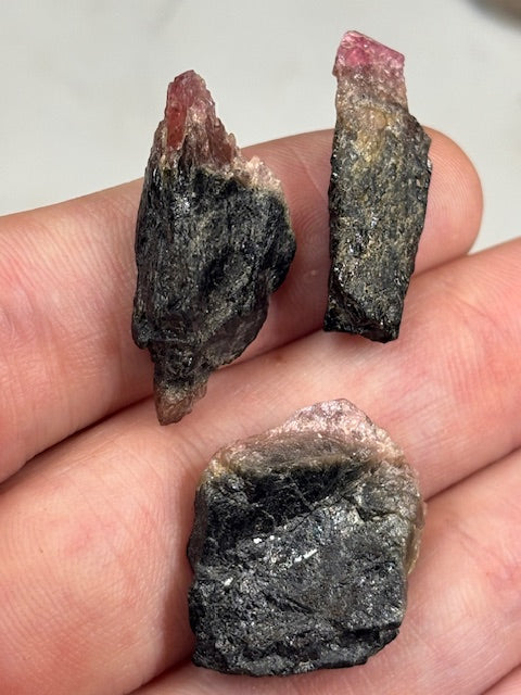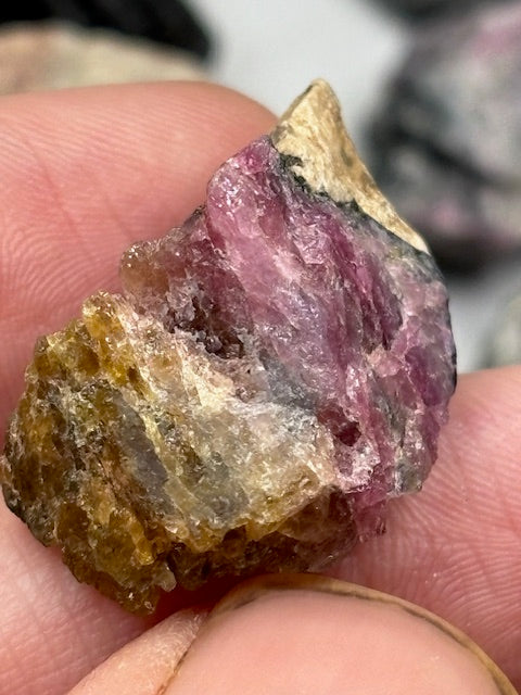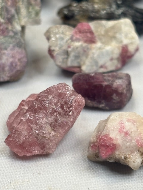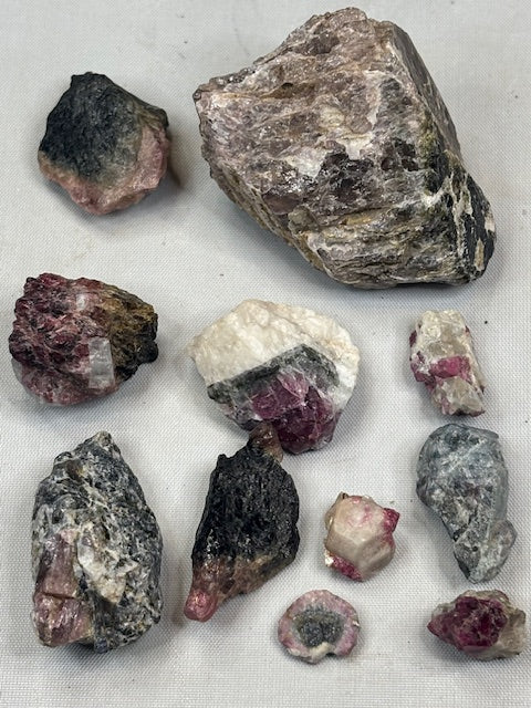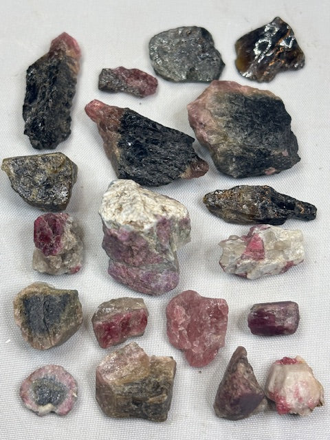 Vom blauen Indigolit Turmalin bis zum Rosa Liddicaotit, roten Rubellit, grünem Verdelith, braunen Dravit, schwarzen Schörl & Wassermelonenturmaline sind alle reichlich vertreten. Am seltensten davon sind jedoch die Indigolit oder weißen Turmaline auch genannt Achroit oder Ichroit Turmalin aber auch von diesen sind mehr als genügend vorhanden.