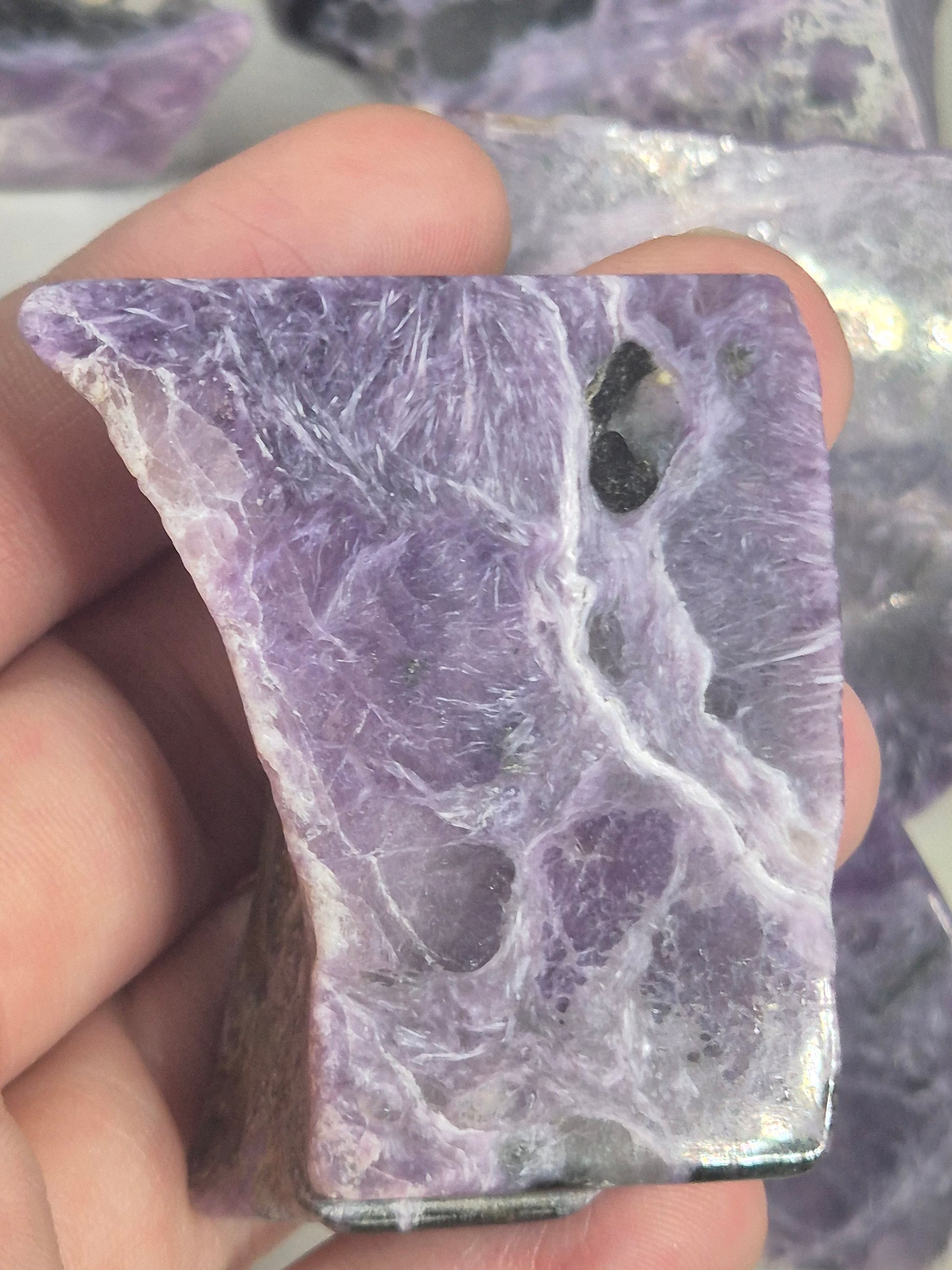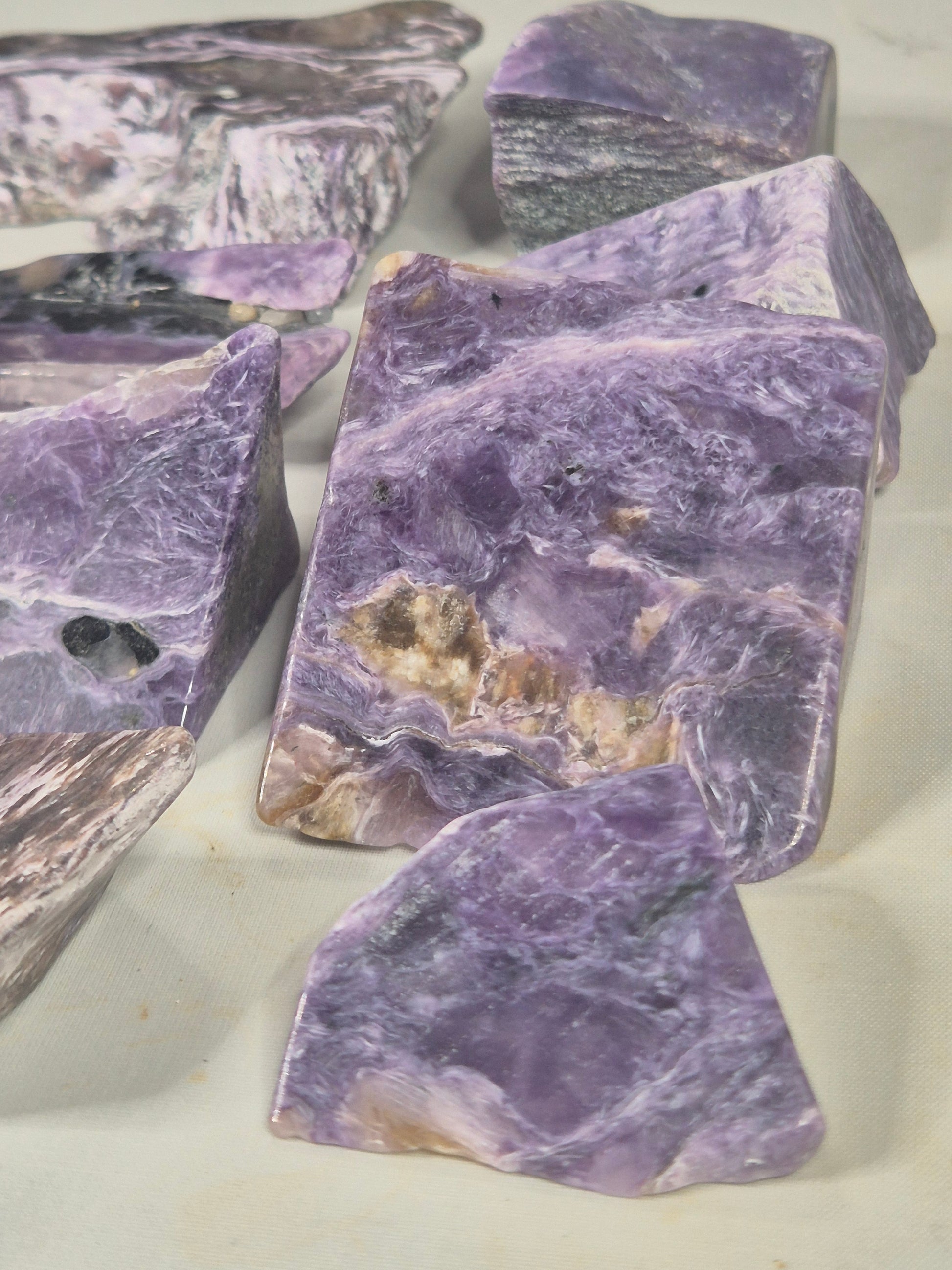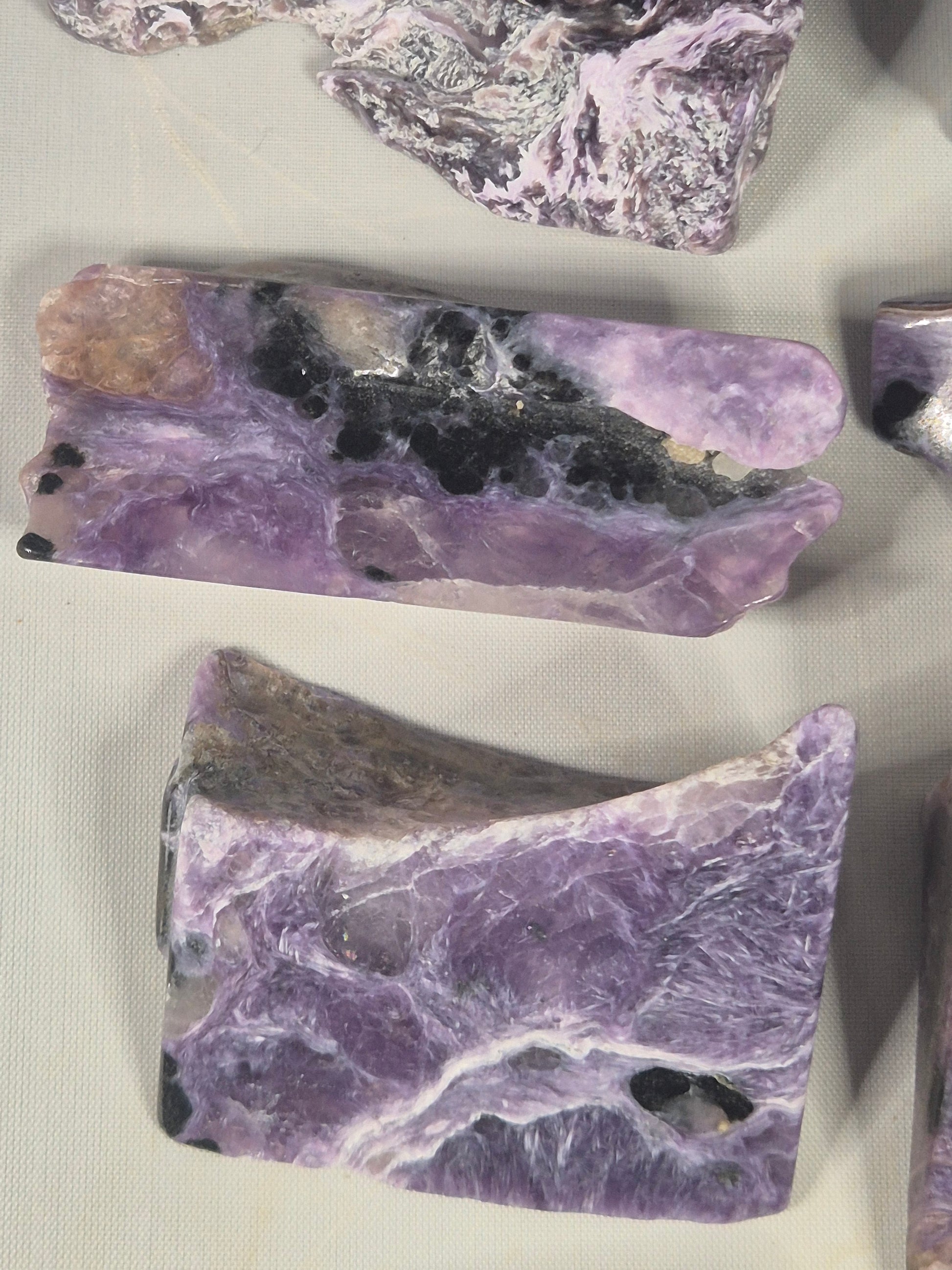 Wunderschöne hochglanzpolierte Charoit mit der typisch wirbelnd faserig sowie fließenden Struktur & intensiv violetten Farbtönen.