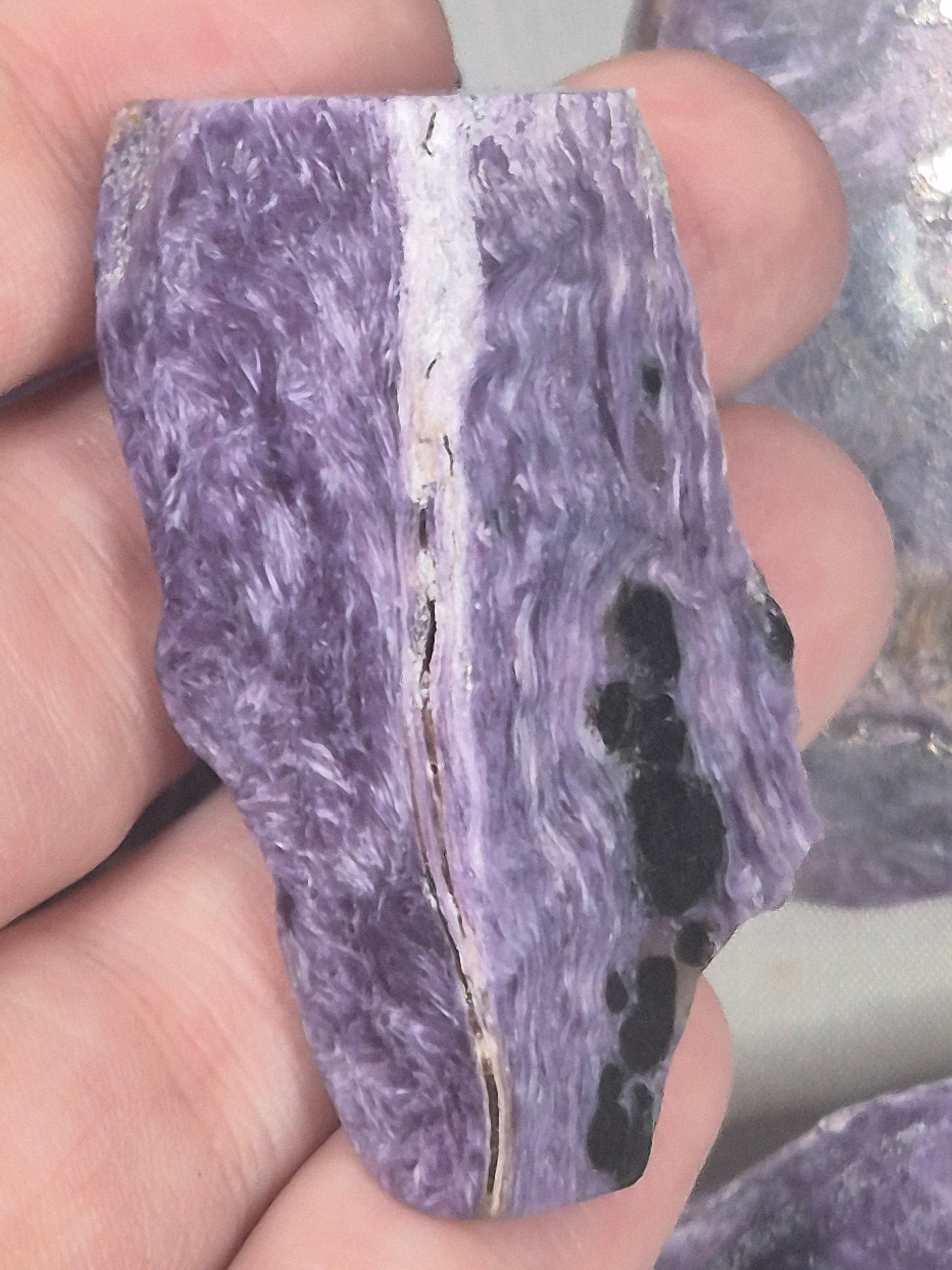Die schwarzen Einschlüsse sind Ägirin zusätzlich hat der Charoit typischerweise noch viele andere seltene Sammlermineralien als Einschlüsse darunter: