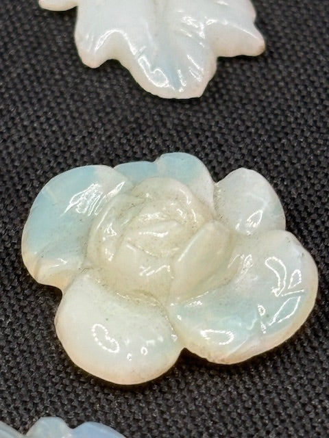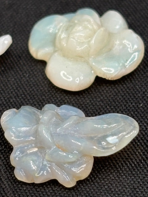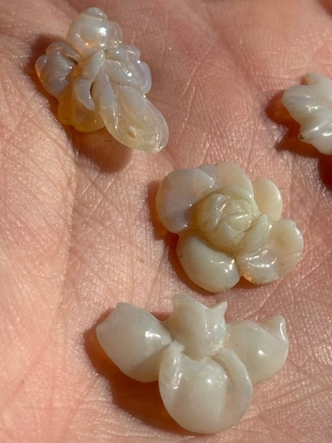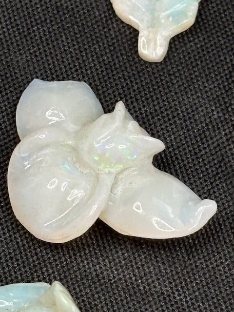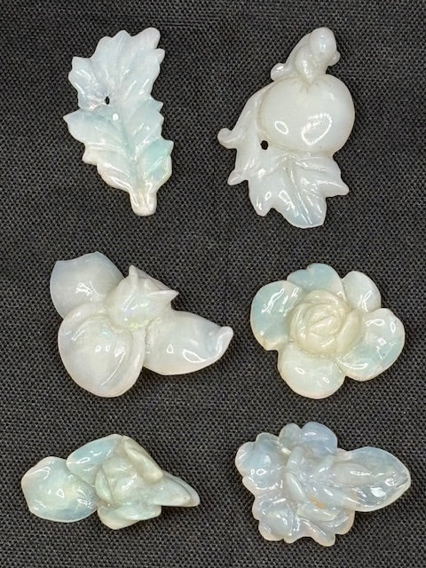 Sehr schöne kleine handgeschnitzte Figuren aus australischem Edelopal mit unterschiedlichen Motiven (meistens Pflanzen aber auch Tierfiguren) & tollem Schimmer.