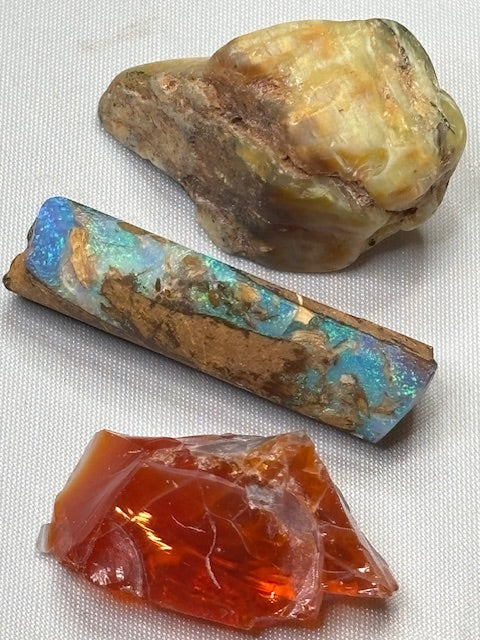Wunderschön schimmernde Edelopale in Edelsteinqualität zur Auswahl stehen ein sehr transparenter intensiv leuchtender rot oranger Feueropal aus Mexiko oder ein großer sehr stark opalisierender Boulder Opal oder ein intensiv schillernder gelber Katzenaugenopal.