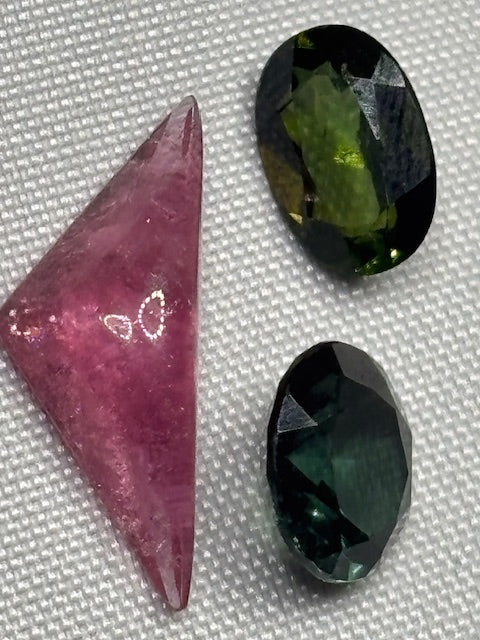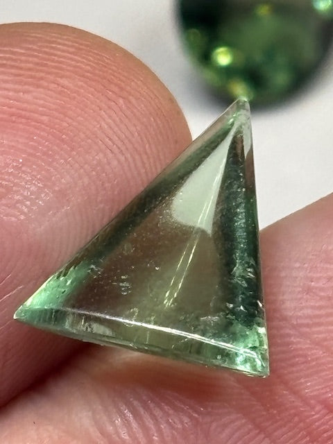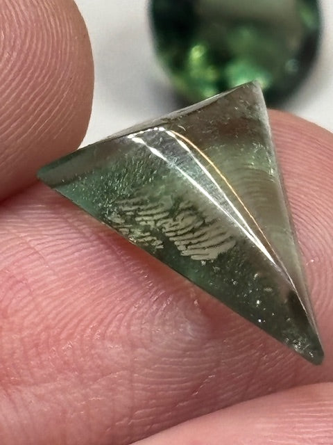 Nummer 1 ist ein dunkelgrünes Turmalin Dreieck (Verdelith) hochglänzend & mit toller Transparenz. Es hat eine Größe von ca. 14x 9mm & wiegt 3,5 Karat