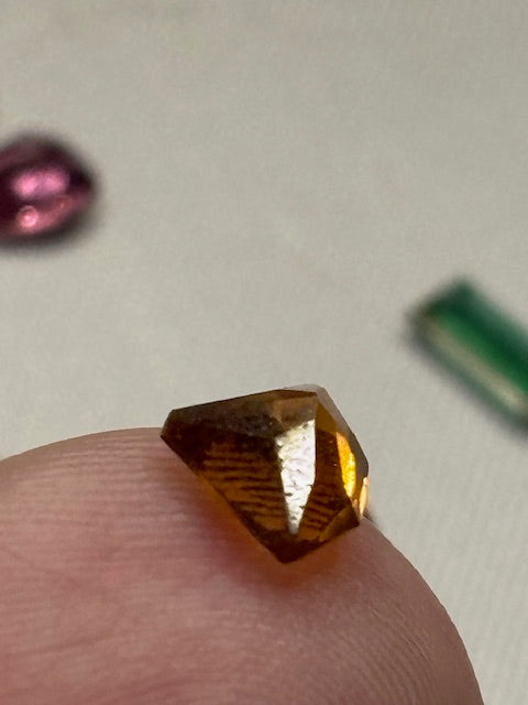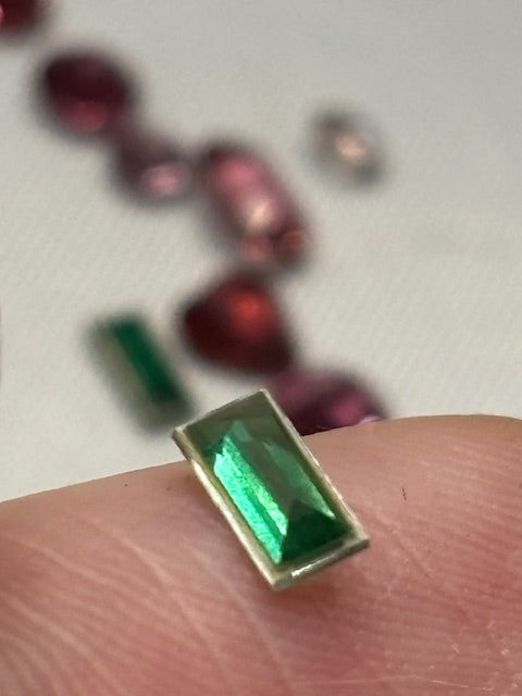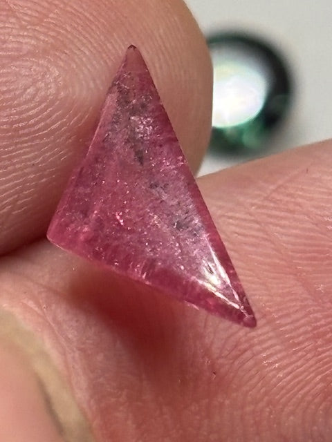 Nummer 5 ist ein rosa Turmalin Dreieck (Rubellith) mit intensiver Farbe & in bester Edelsteinqualität. Es hat eine Länge von ca. 15mm & wiegt 1,5 Karat
