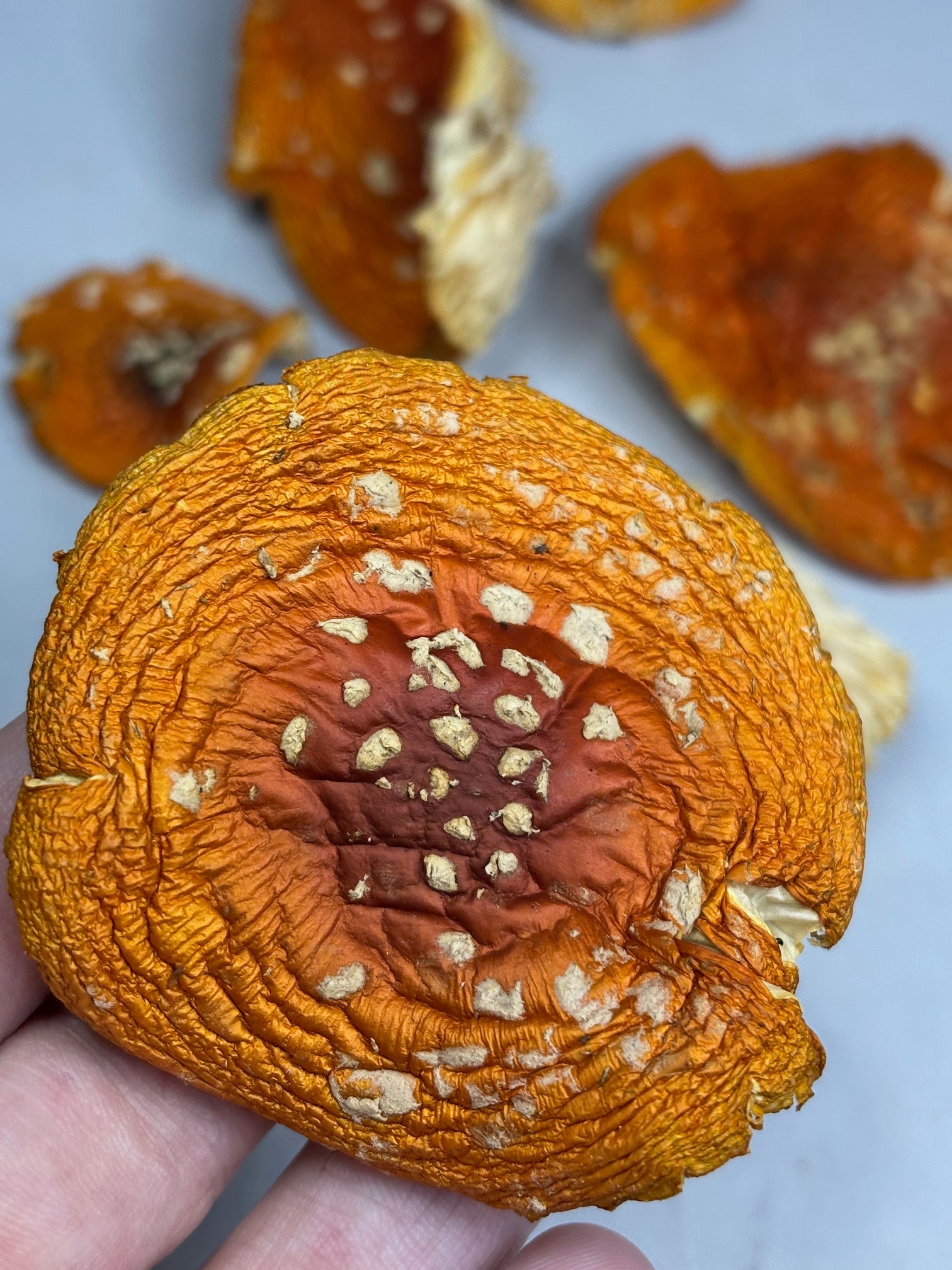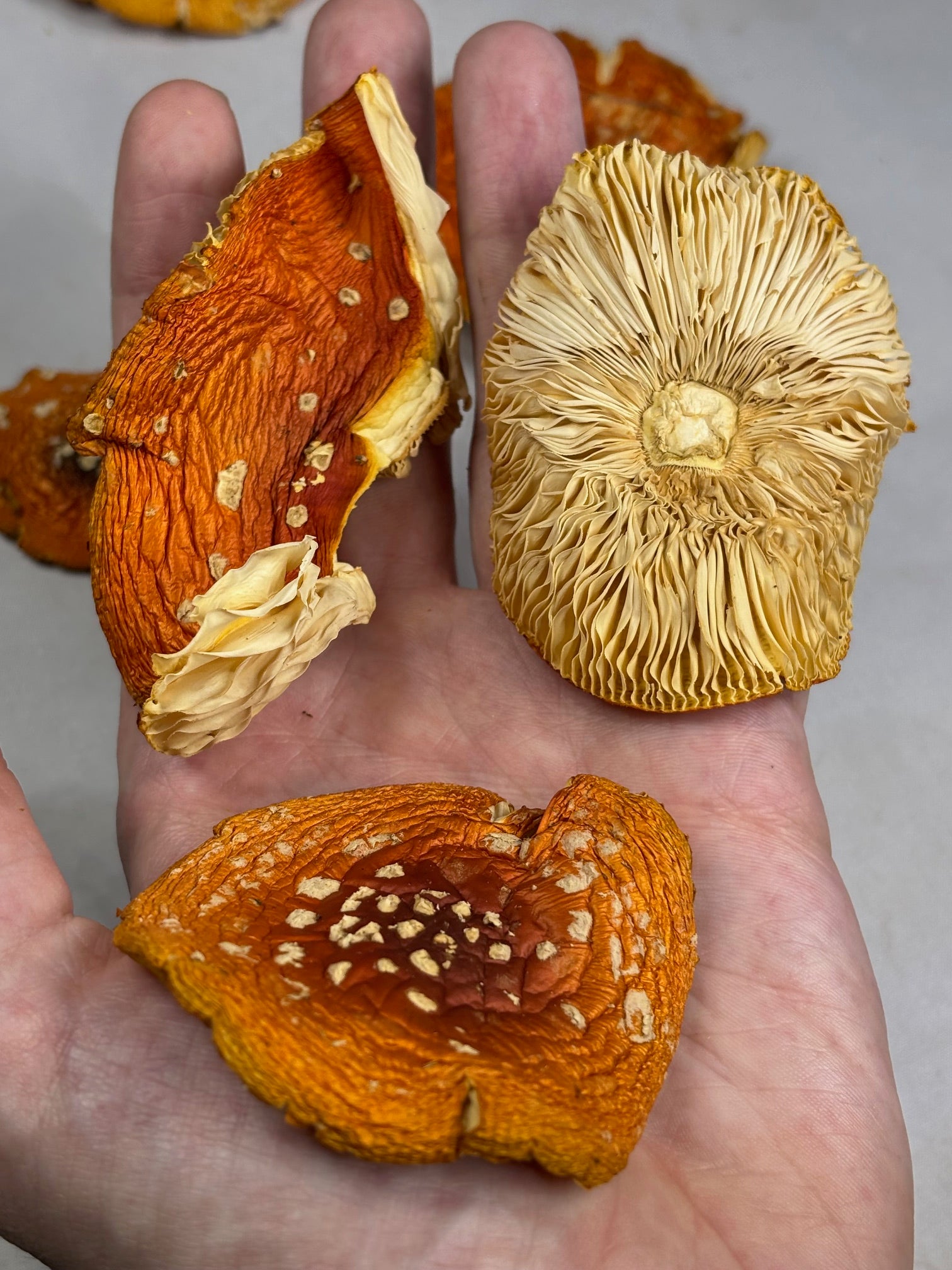 Außergewöhnlich wohlriechende völlig naturbelassene reine rote Fliegenpilzkappen, aus nachhaltiger Wildsammlung.