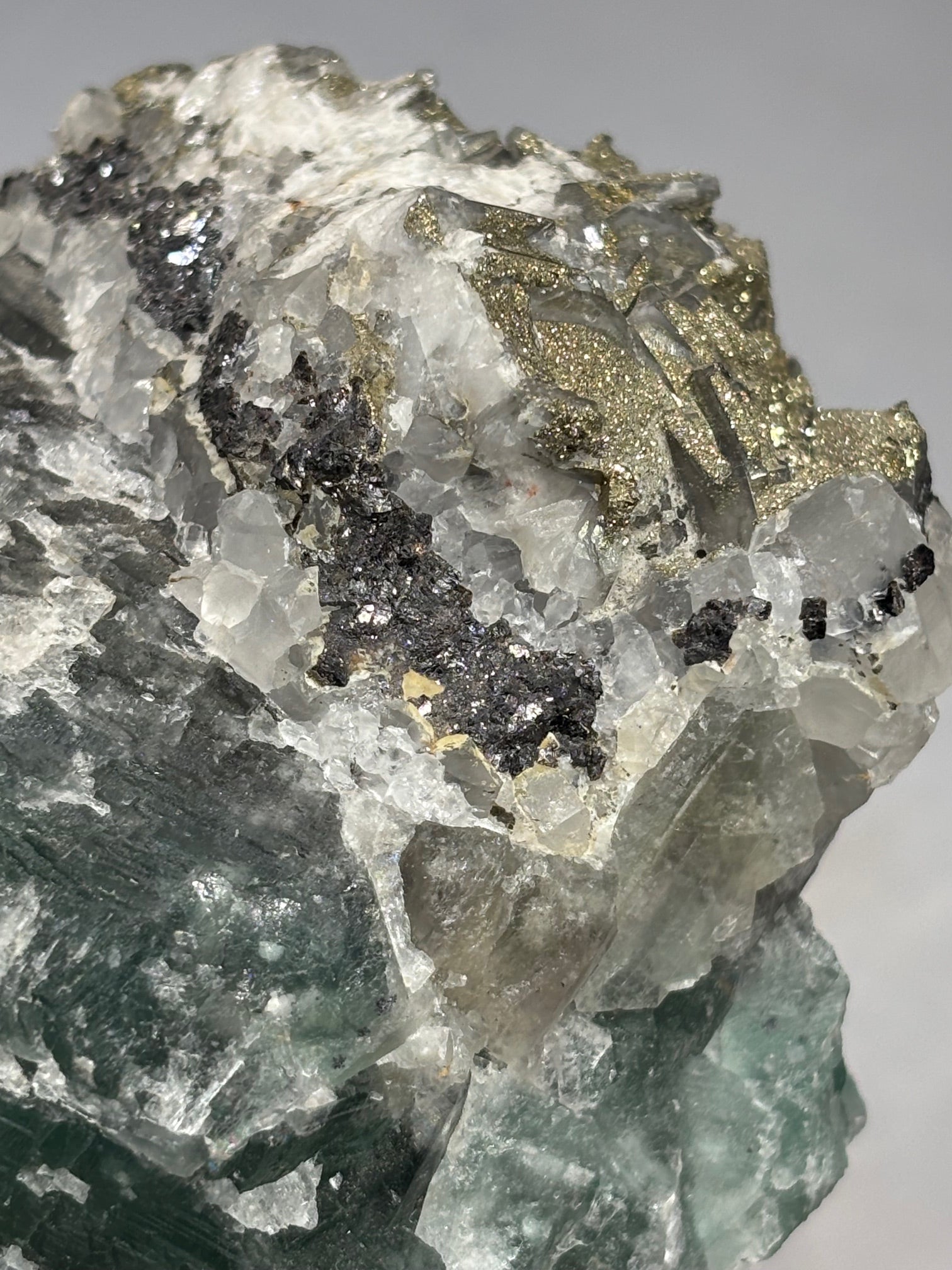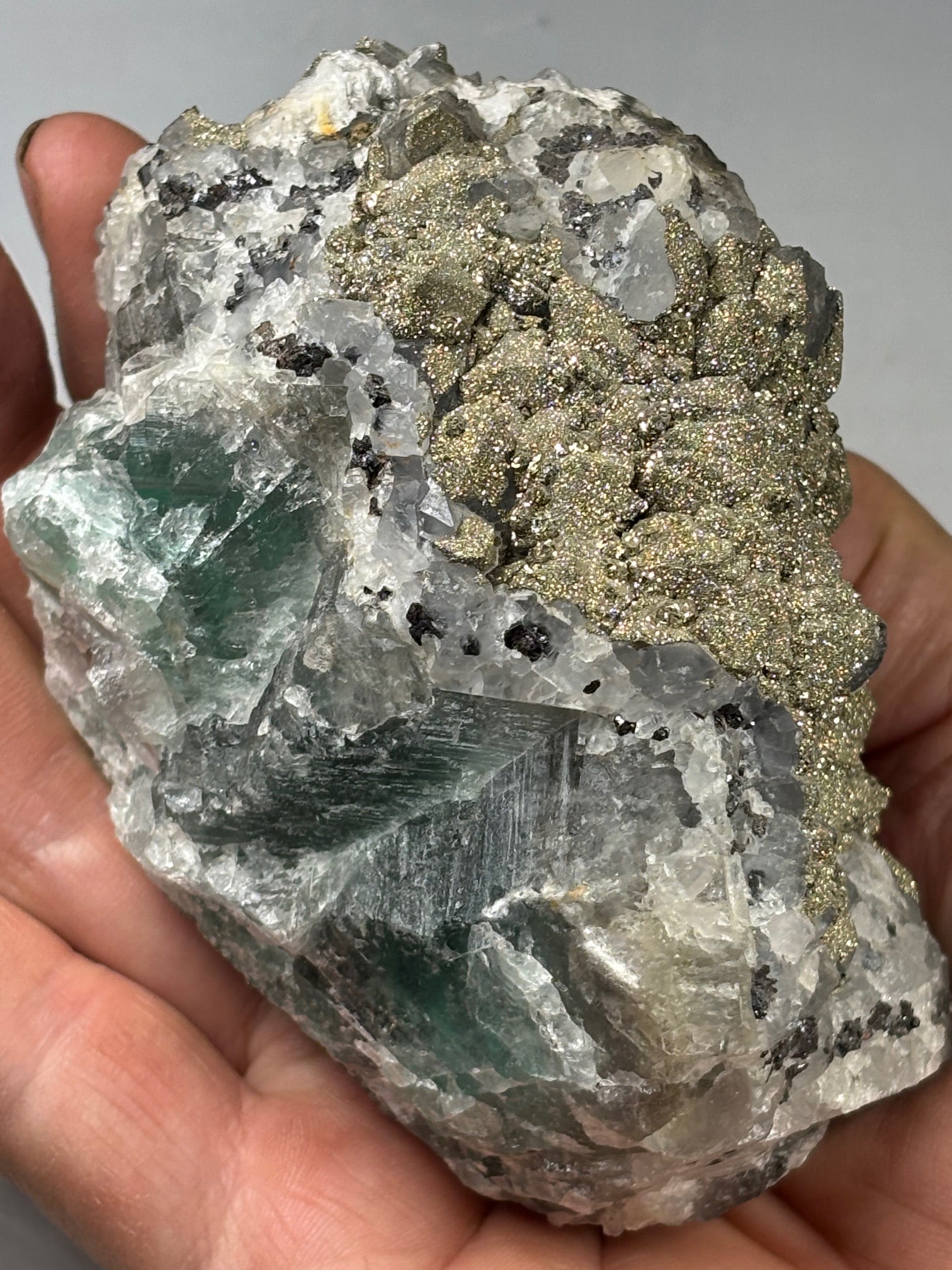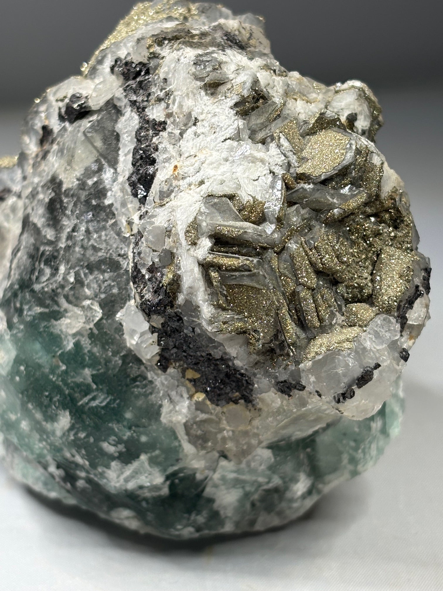 Außergewöhnliches Sammlerstück bestehend aus grünen & blauen UV aktiven Fluorit, darauf befinden sich viele große Baryt Kristalle. Diese wurden schön "überzuckert" von hochglitzerndem golfarbenen Pyrit.