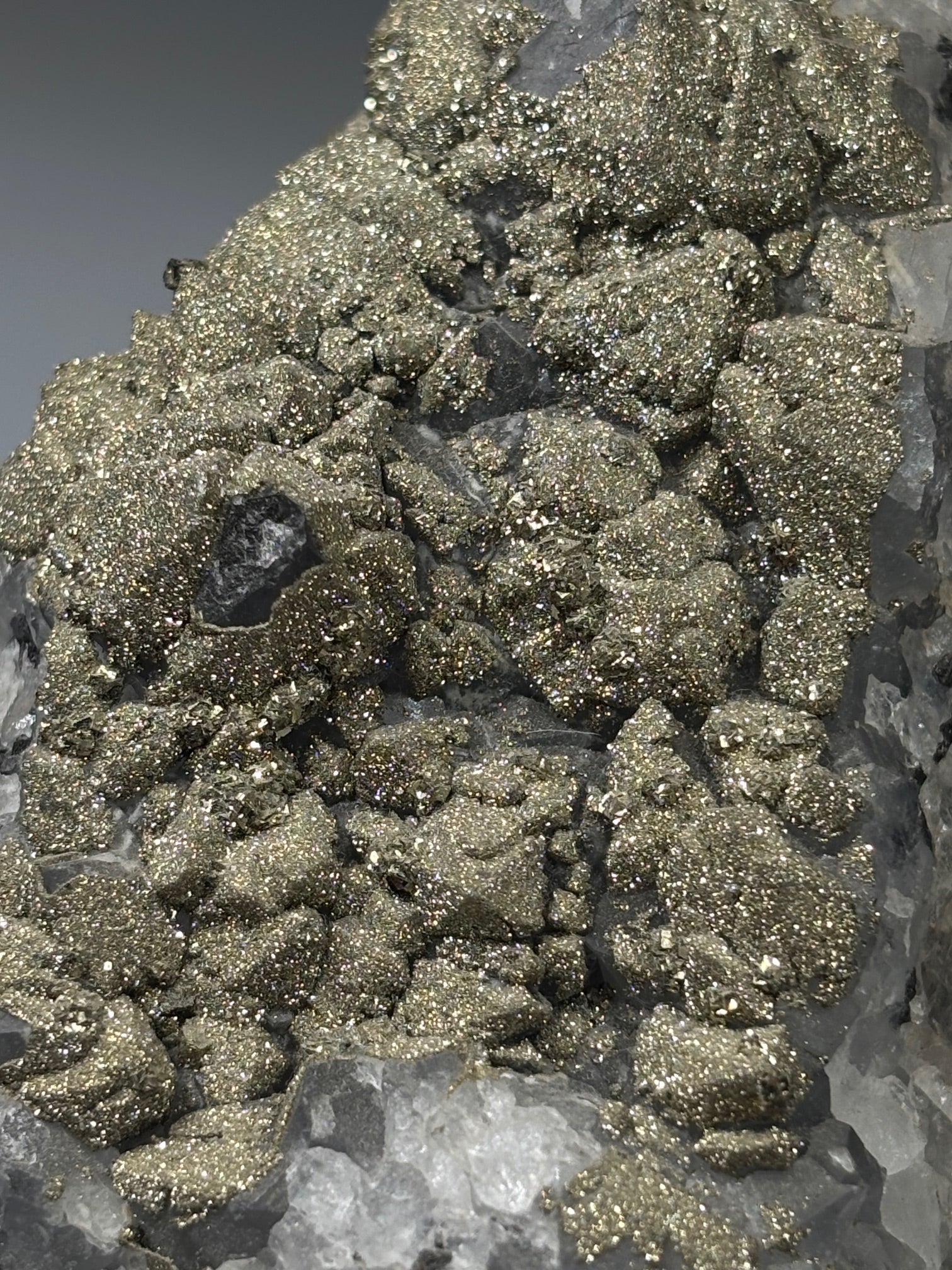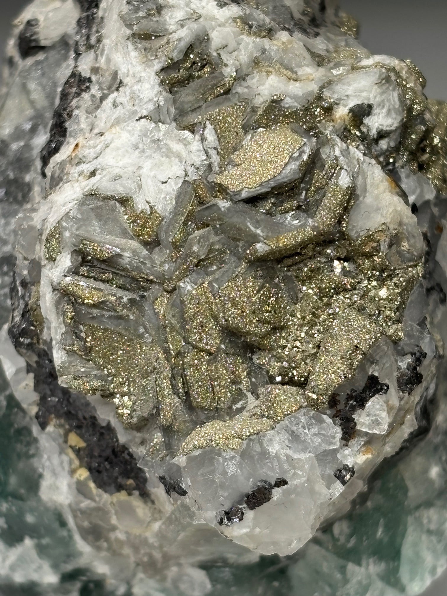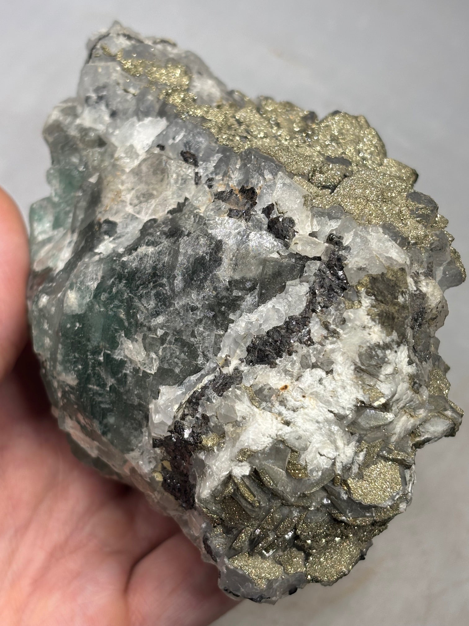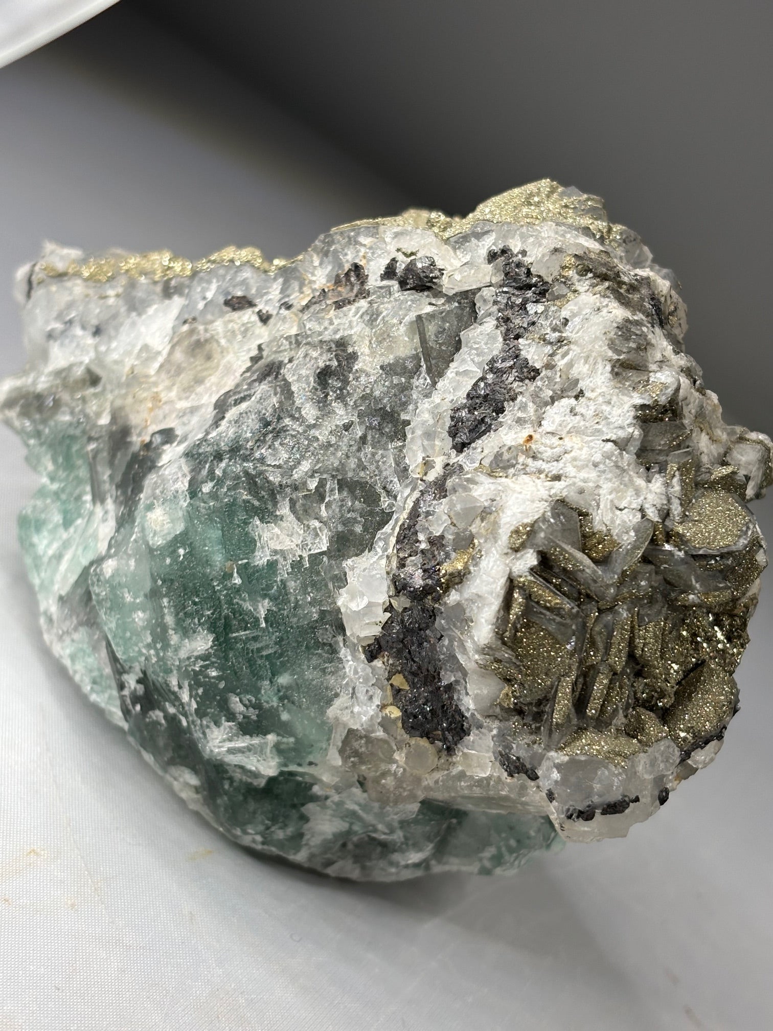 Außergewöhnliches Sammlerstück bestehend aus grünen & blauen UV aktiven Fluorit, darauf befinden sich viele große Baryt Kristalle. Diese wurden schön "überzuckert" von hochglitzerndem golfarbenen Pyrit.