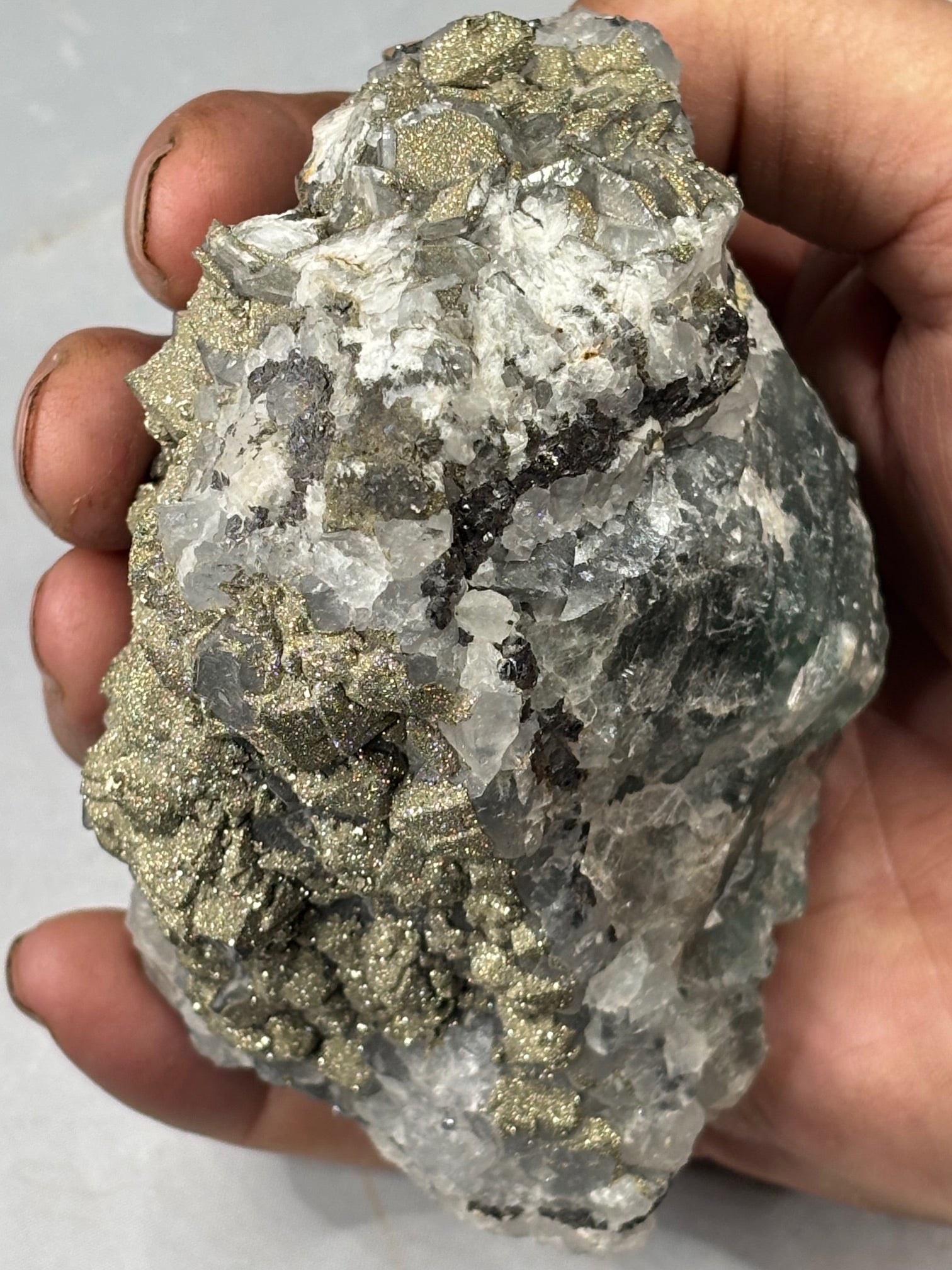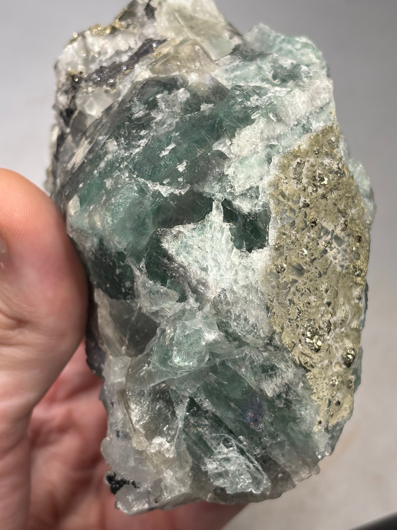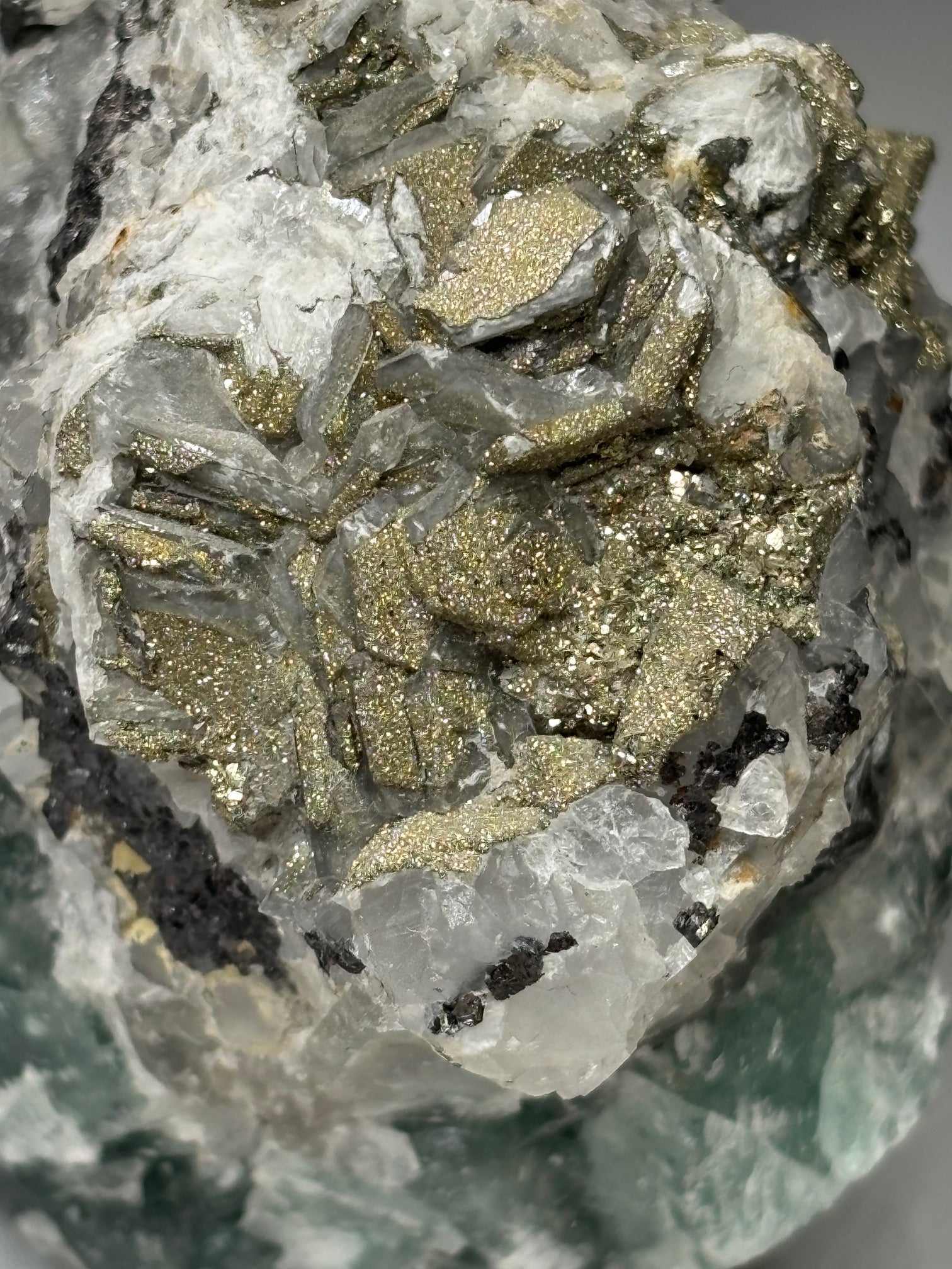 Fluorit grün blau (UV Aktiv) mit Baryt Kristallen + Pyrit überzogen, Marokko Regenbogenfluorit Baryt Pyrit Sonne