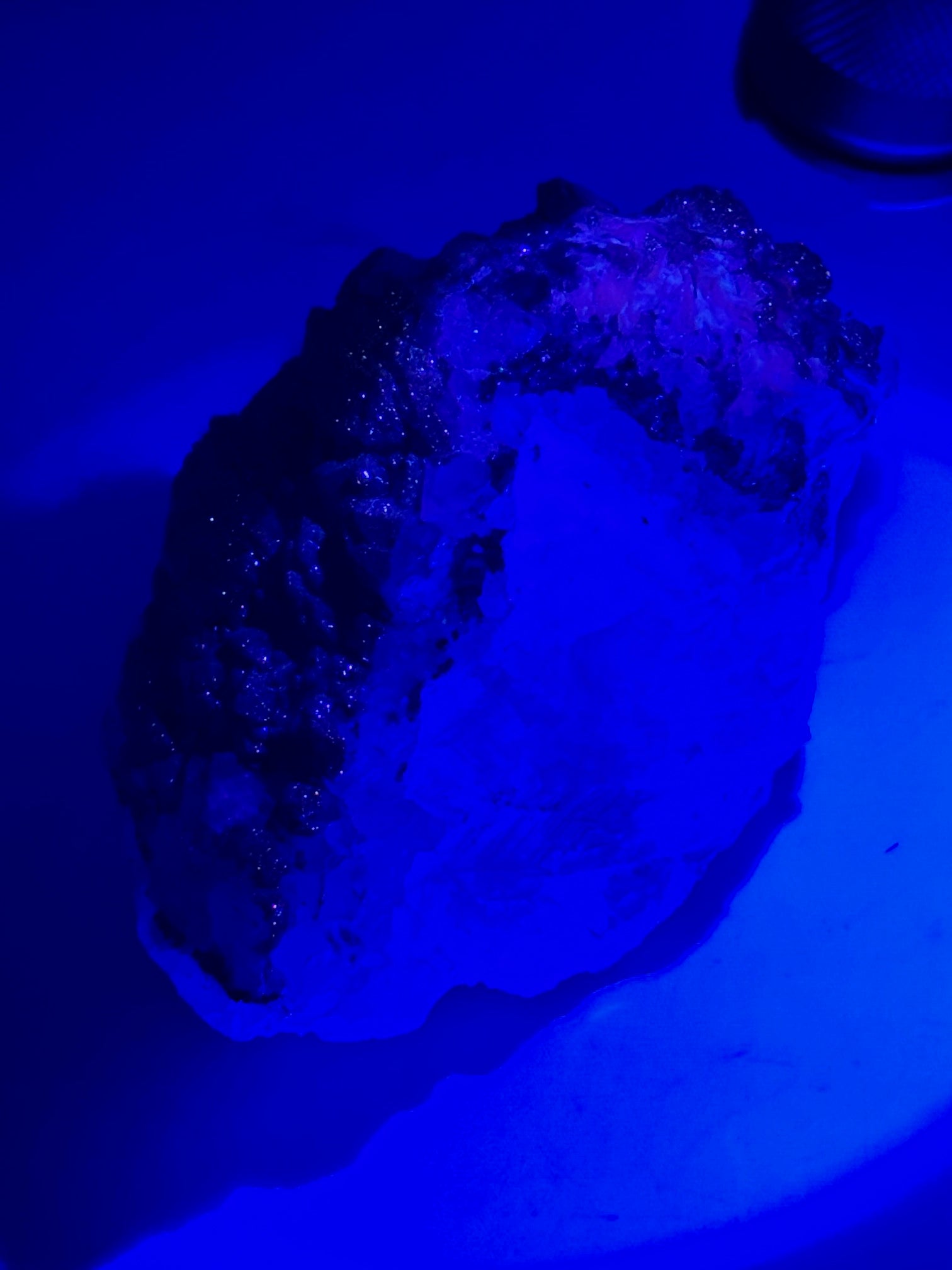 Der Fluorit wird unter UV Licht dunkelblau was teilweise sogar schon im Sonnenlicht leicht erkennbar ist.