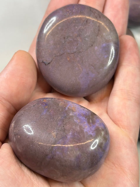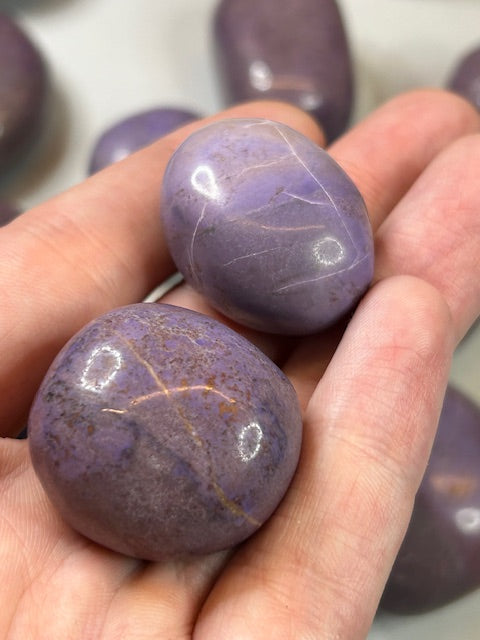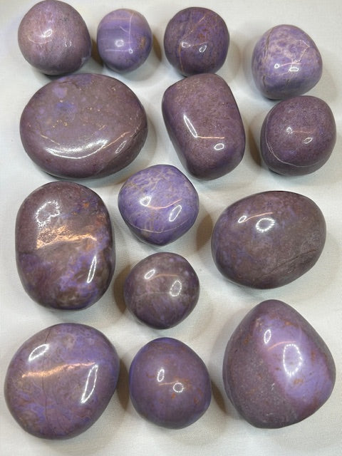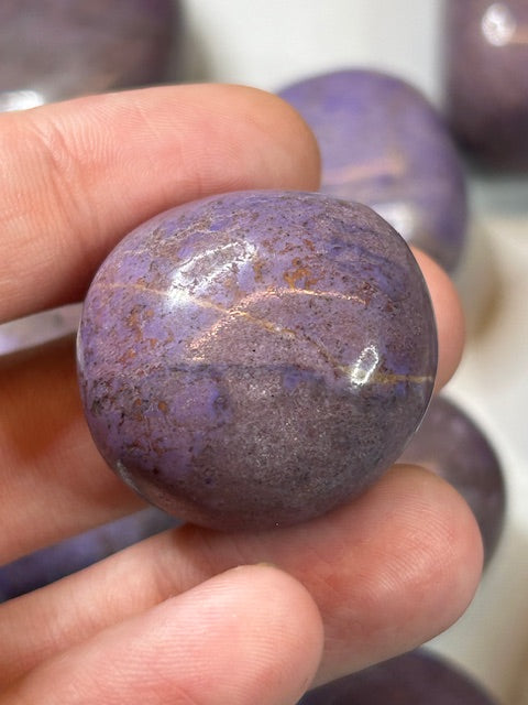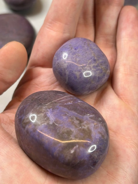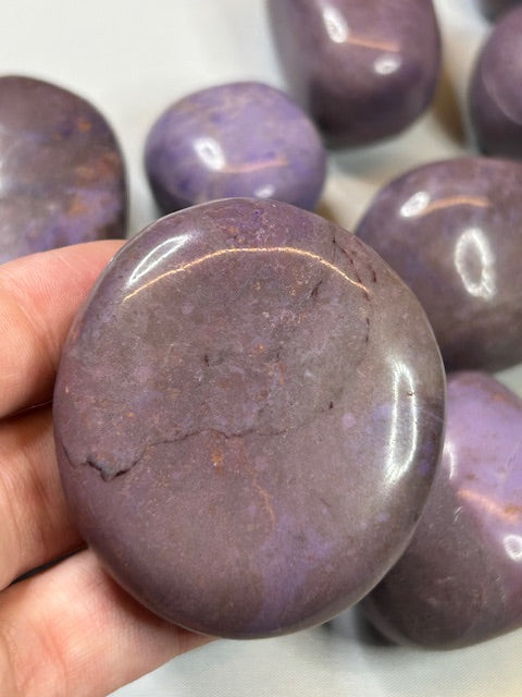 Wunderschöne violette Jadeit Trommelsteine oder Handschmeichler, in den für Lavendeljade typischen verschiedenen violett- rosafarbenen Farbtönen auf hochglanz poliert.