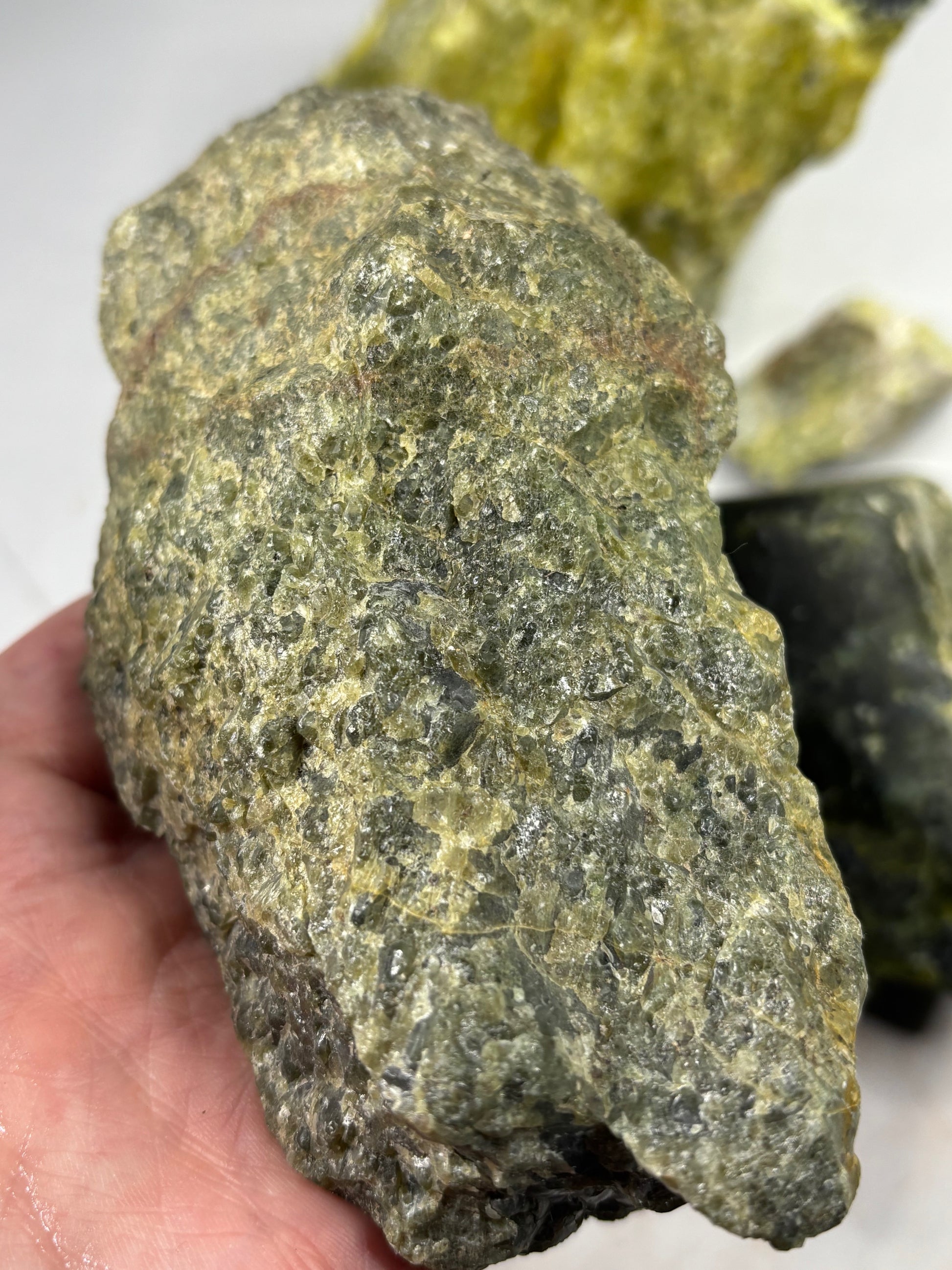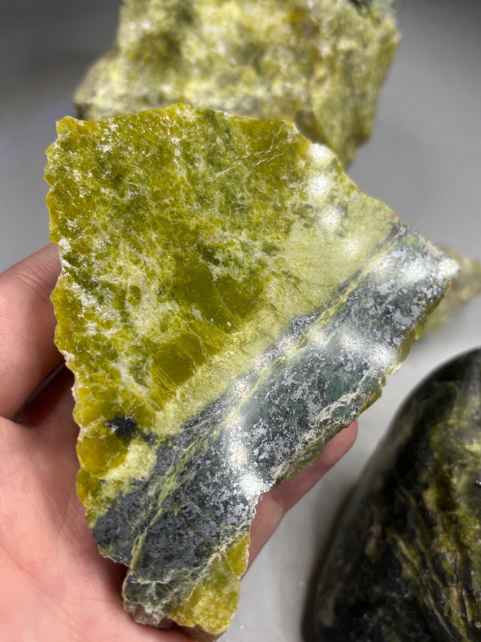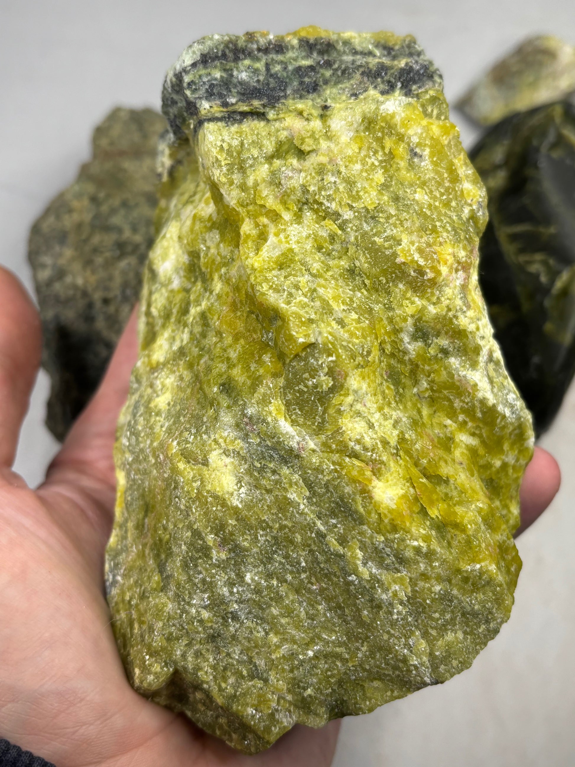 Wunderschöne Lizardit Rohsteine, teilweise mit weißem oder rosa Magnesit, Hämatit, Granat & vielen anderen Einschlüssen beliebter Mineralien.
