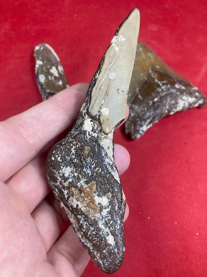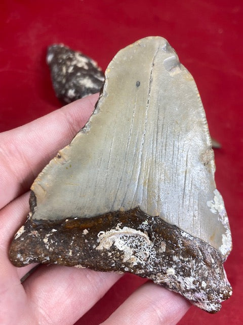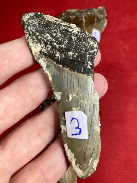 Sehr schöne große naturbelassene & günstige Megalodon Hai Zähne bzw. Zahnfragmente. Sie wurden erst 2023 vom Meeresboden 65km vor der Küste von North Carolina mit dem U-Boot geborgen.