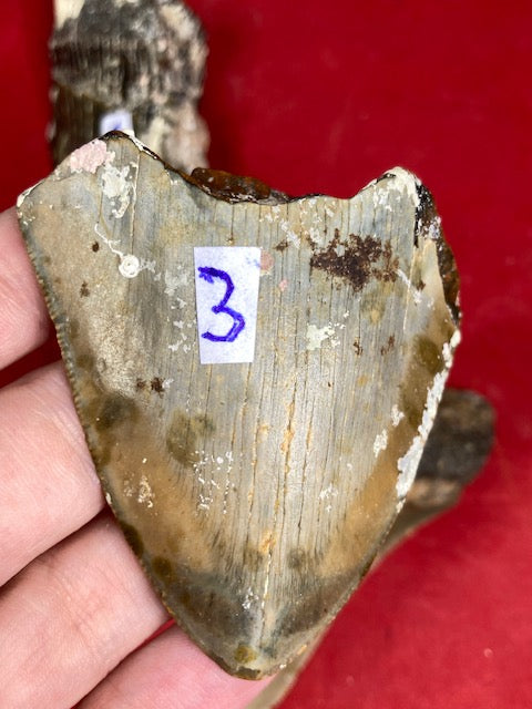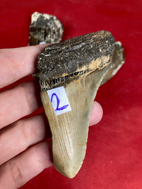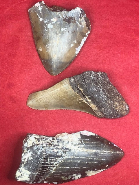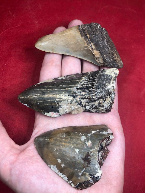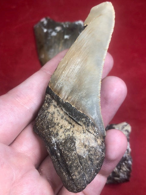 Sehr schöne große naturbelassene & günstige Megalodon Hai Zähne bzw. Zahnfragmente. Sie wurden erst 2023 vom Meeresboden 65km vor der Küste von North Carolina mit dem U-Boot geborgen.