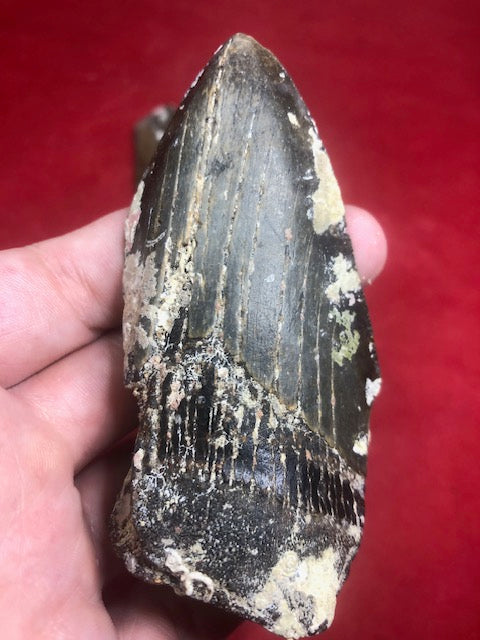 Nummer 2 ist ein ca. 9cm langes Zahnfragment mit besonders schöner braun oranger Färbung & ohne zusätzliche Fossilien. Er hat ein toll erhaltenes braunes Bourrelet & einseitig eine außergewöhnlich gut erhaltene, scharfe & vollständige Zahnung. Sein braun oranger Zanschmelz & die massive Zahnwurzel sind auch bester Qualität
