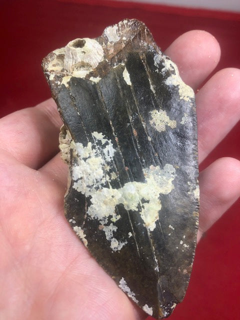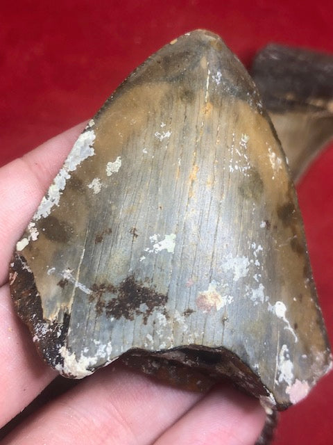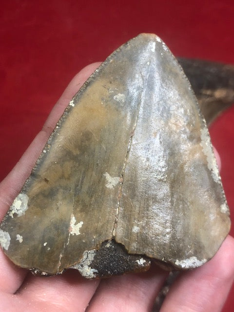Nummer 3 ist ein großer Megalodon Zahn mit einer Kantenlänge von ca, 7cm & das komplett ohne Wurzel. Zusätzlich hat er eine besonders schöne orange braune Färbung. Der Zahn des Urzeitgiganten hat teilweise verschiedenste weiß rosa Meeresboden Fossilien die das Sammlerstück umso interessanter machen. Zahnschmelz sowie die Zahnung sind außergewöhnlich gut erhalten geblieben teilweise sehr scharf.