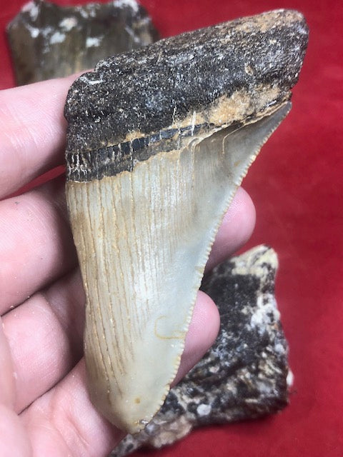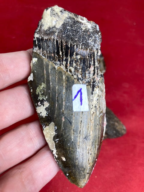 Nummer 1 dieser Megalodon Zahn hat eine Kantenlänge von ca. 9cm, er hat ein ganz gut erhaltenes schwarzes Bourrelet, aber ist fast ohne Wurzel. Die vorhandene Zahnwurzel ist ebenfalls schwarz, teilweise hat er eine außergewöhnlich gut erhaltene, scharfe & fast vollständige Zahnung. Der blau schwarze Zahnschmelz dieses Megalodon Zahnes ist ebenfalls in bester Erhatung. Auf der Rückseite befinden sich versteinerte weiße Muscheln in sehr gutem Zustand. Dieser Zahn hat überhaupt sehr viel weiße & rosa Meeresboden Fossilien was einen tollen Kontrast bildet.