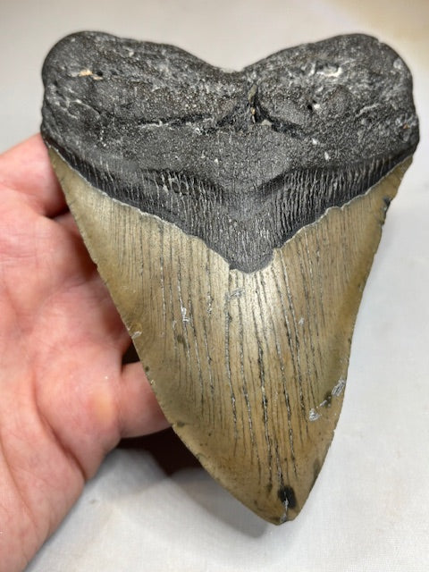 Sehr großer außergewöhnlich gut erhaltener Megalodon Zahn mit sehr breiter Wurzel & "rasiermesserscharfer" Zahnung.