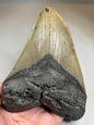 Der fossile Haizahn hat eine schwarz, braun, gräuliche Färbung & eine sehr breit gebaute noch gut erhaltene aber leicht erodierte schwarze Zahnwurzel. Sein grau braun gefärbter Zahnschmelz ist bestens erhalten & er hat eine sehr scharfe Zahnung. Dieser Megalodon Zahn hat ein beeindruckend gut erhaltenes schwarzes Bourrelet.