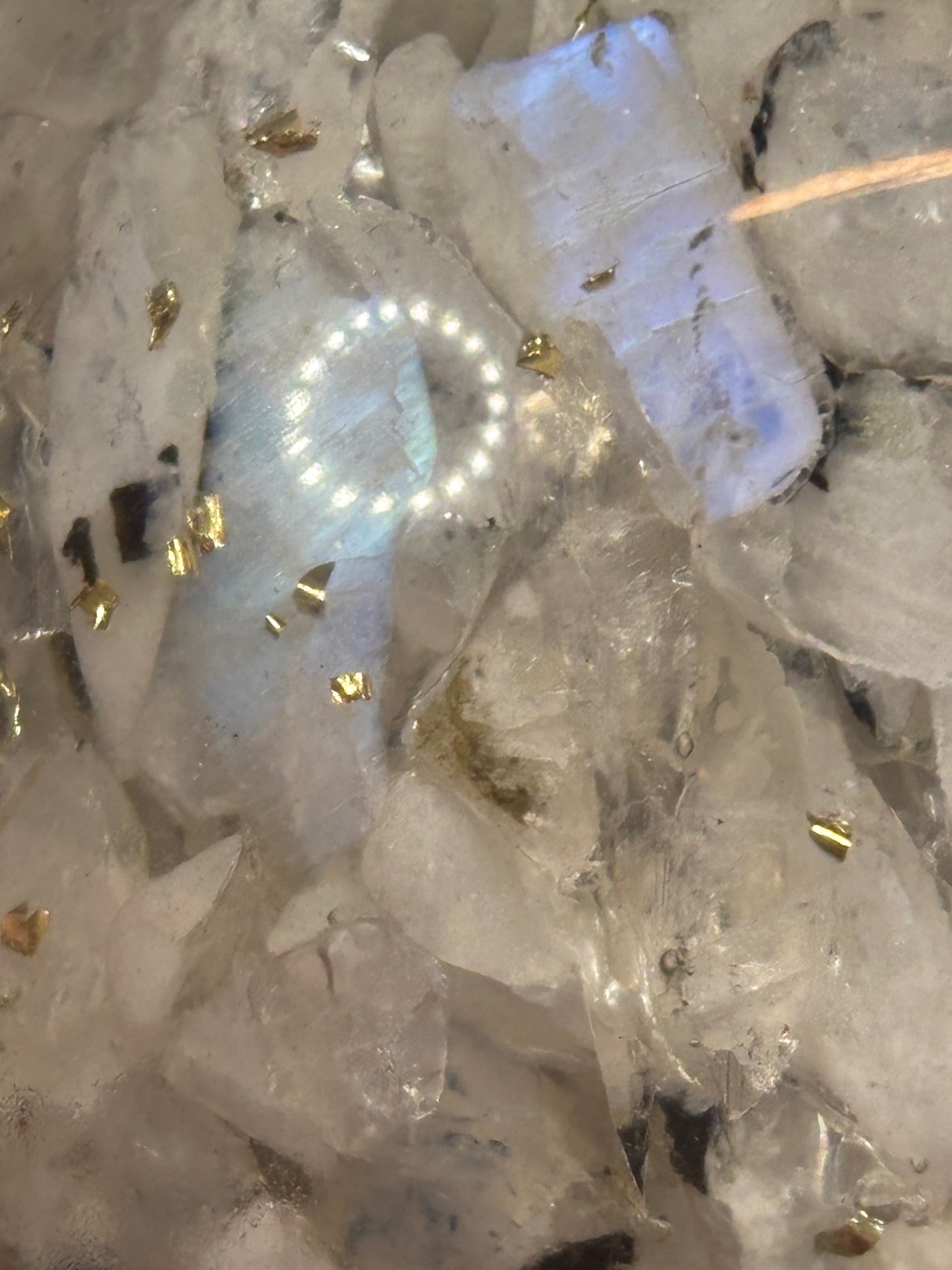 Sie bestehen aus Heilsteinen, Kupfer, Blattgold & organisch pflanzliches Epoxidharz.