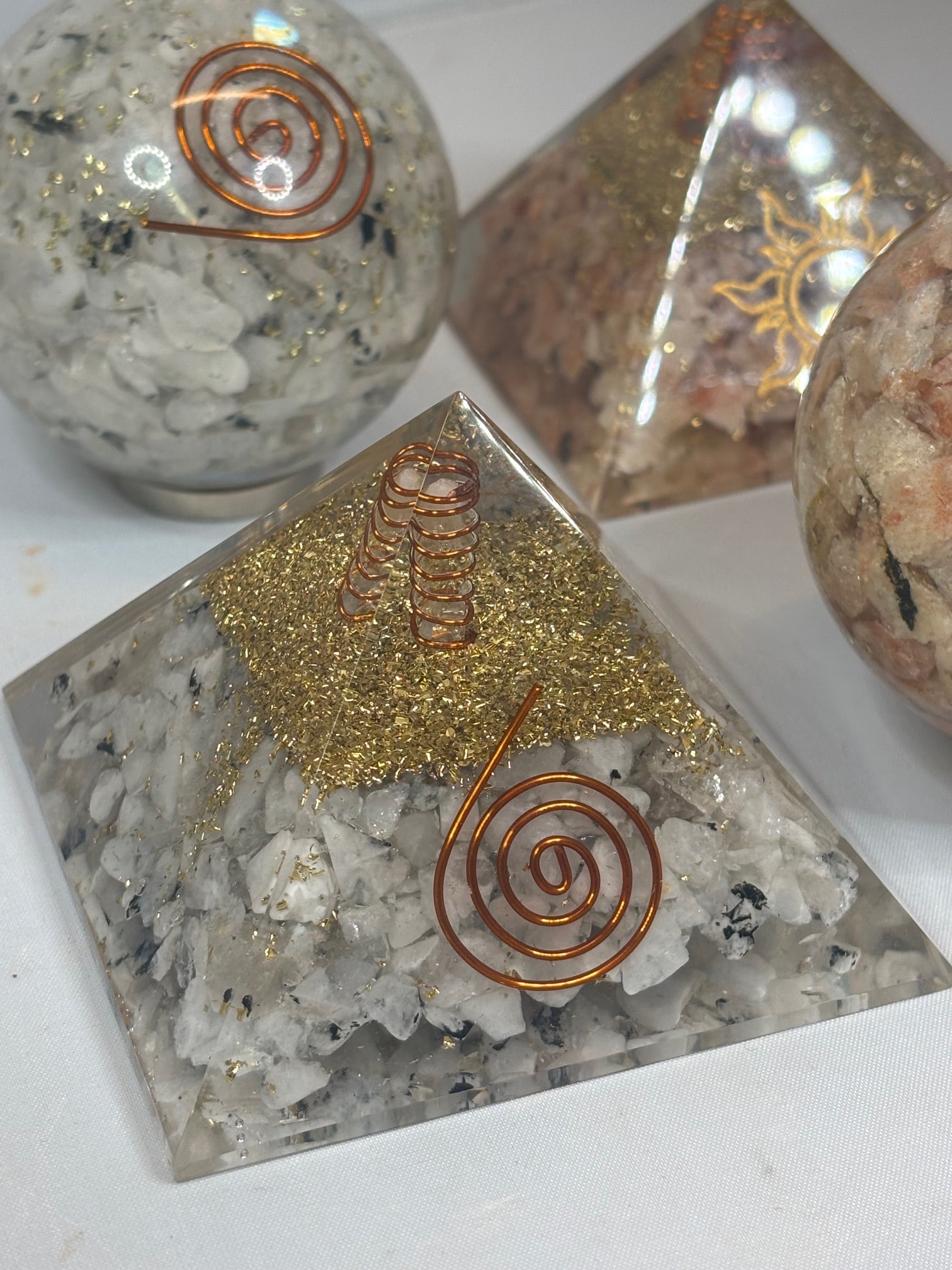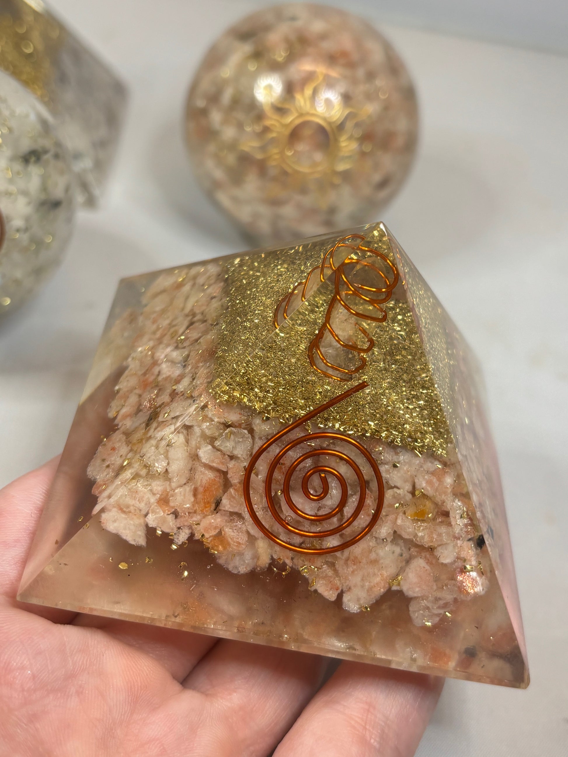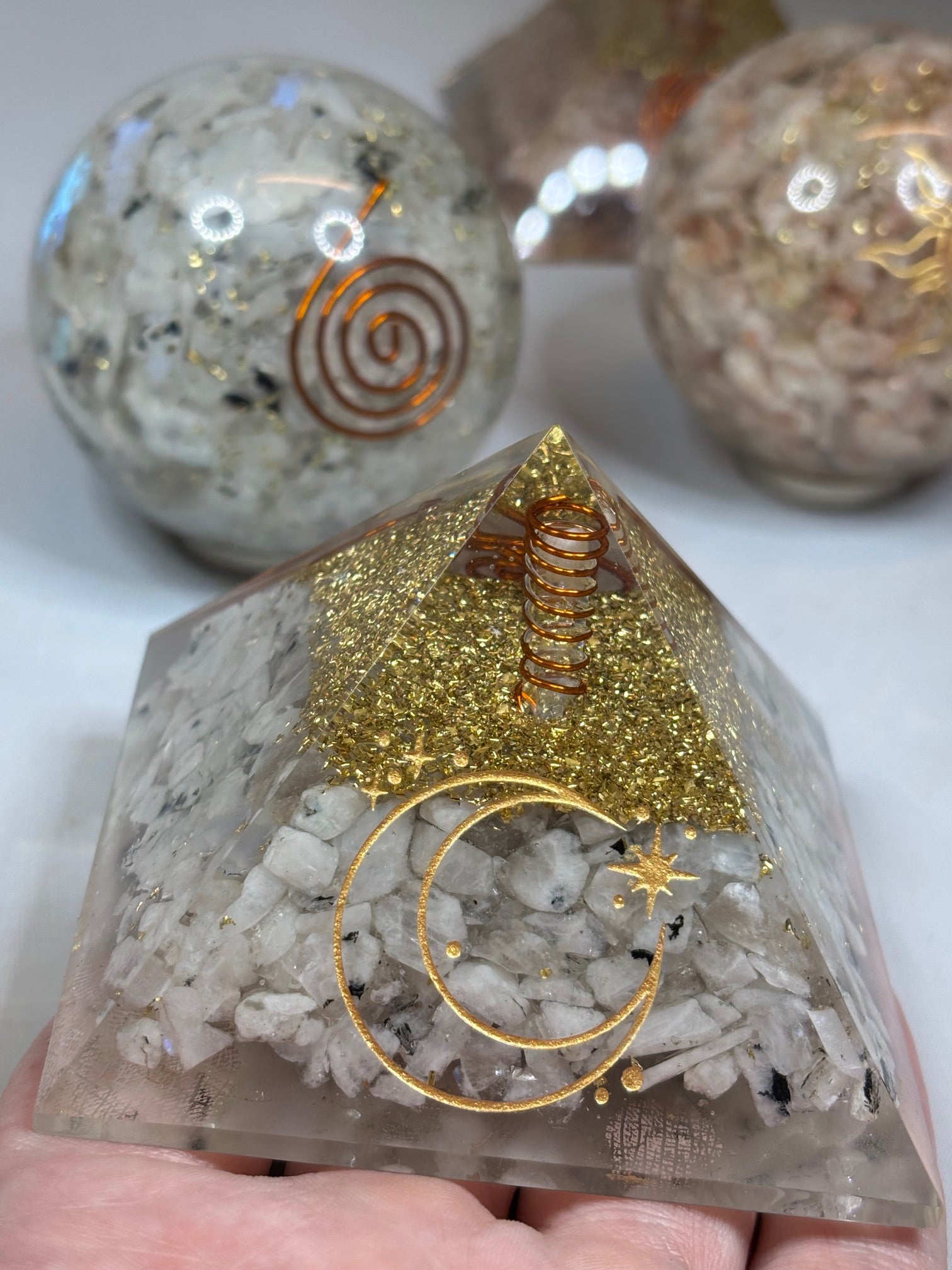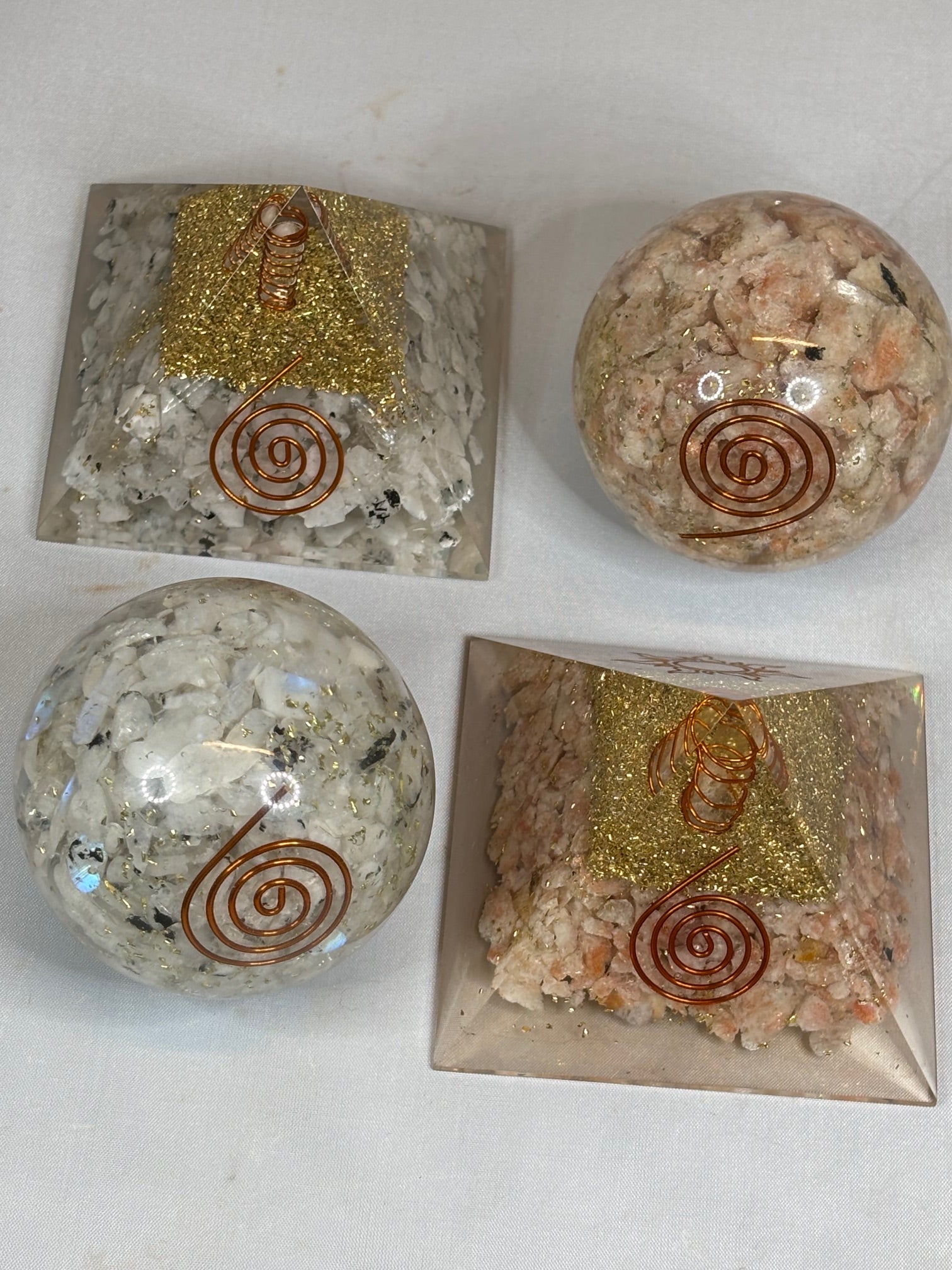 Wunderschöne hochglänzende Mondstein sowie Sonnenstein Orgonit Pyramide oder Kugel.