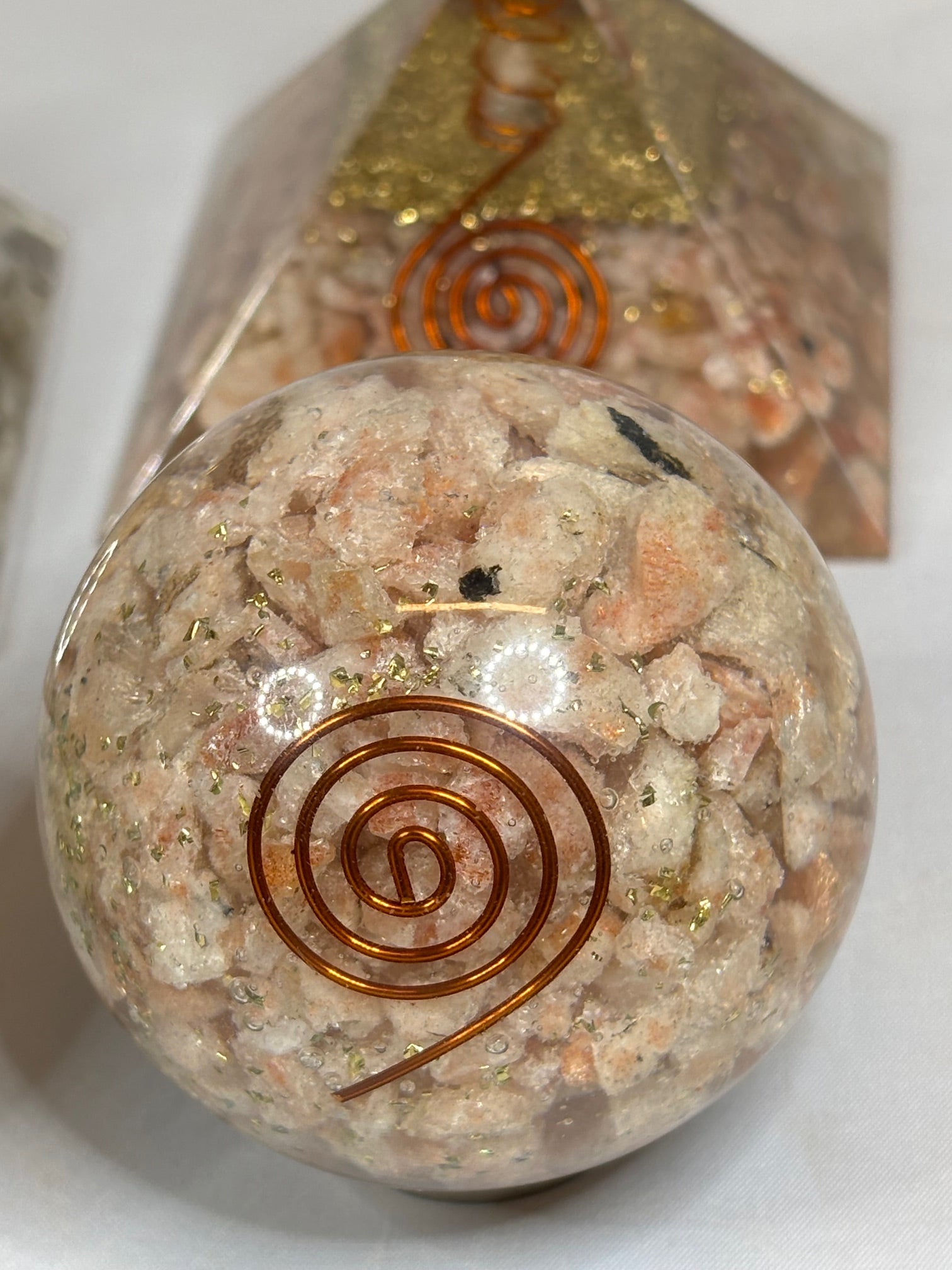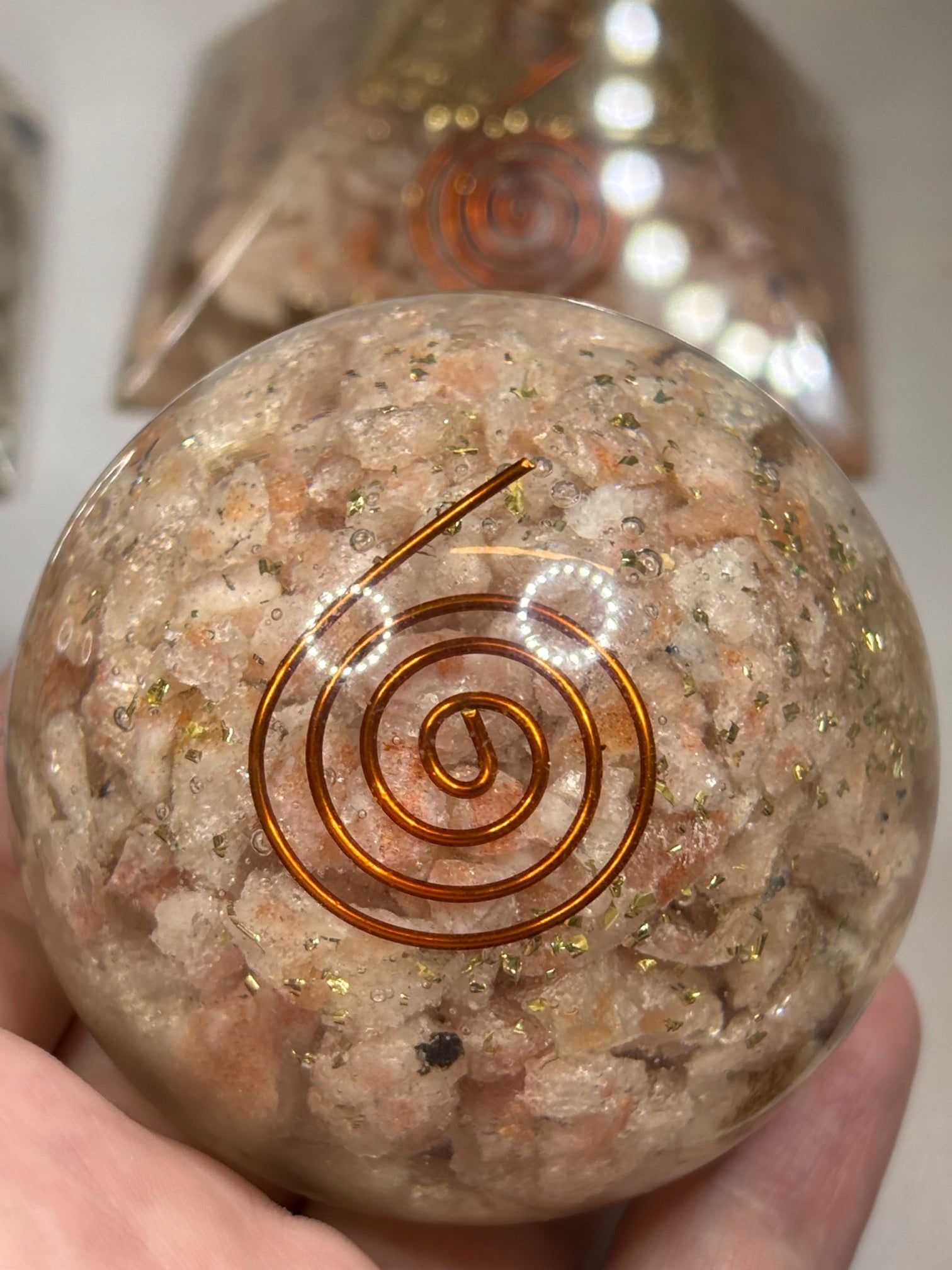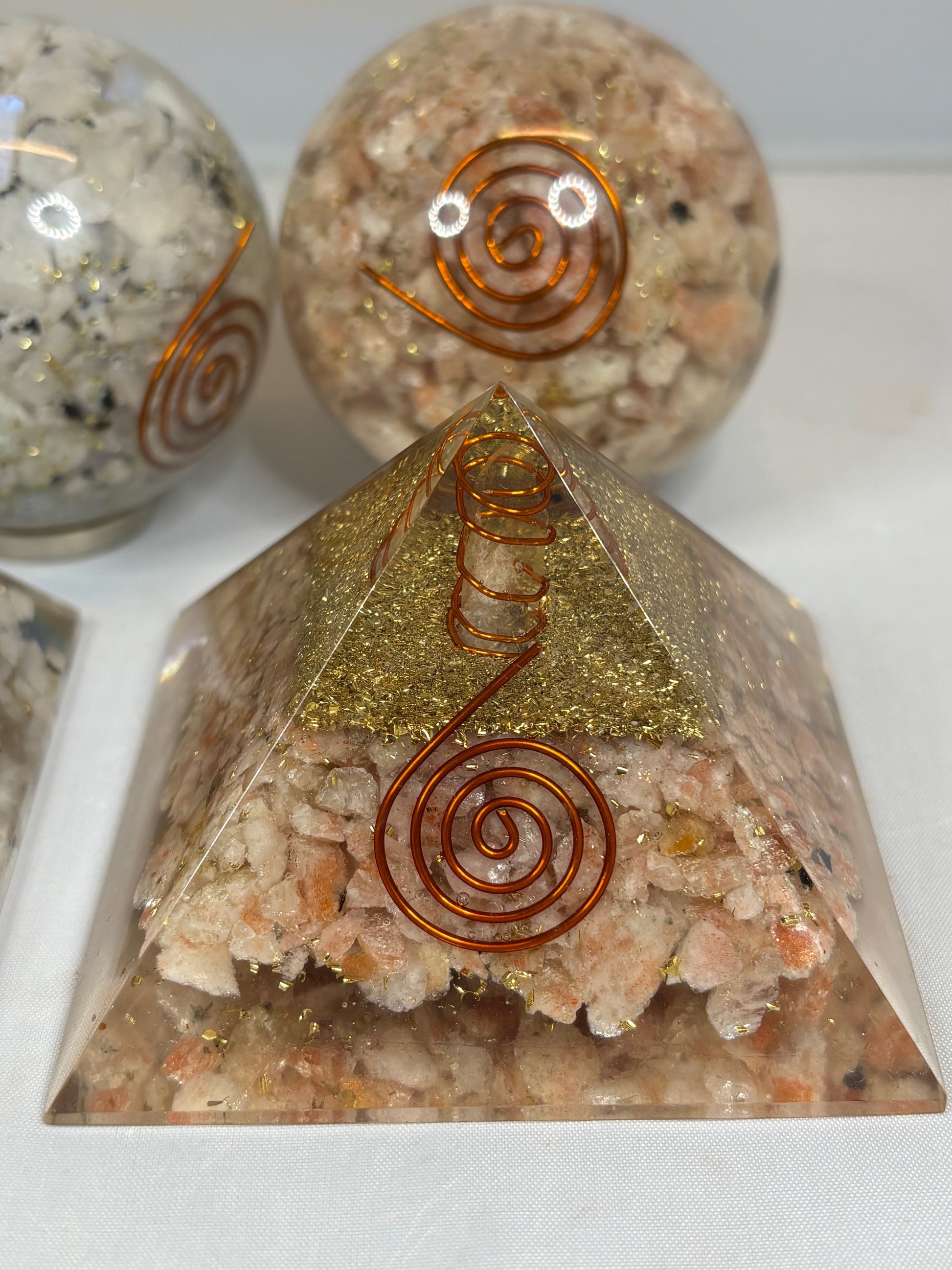 Wunderschöne hochglänzende Mondstein sowie Sonnenstein Orgonit Pyramide oder Kugel.
