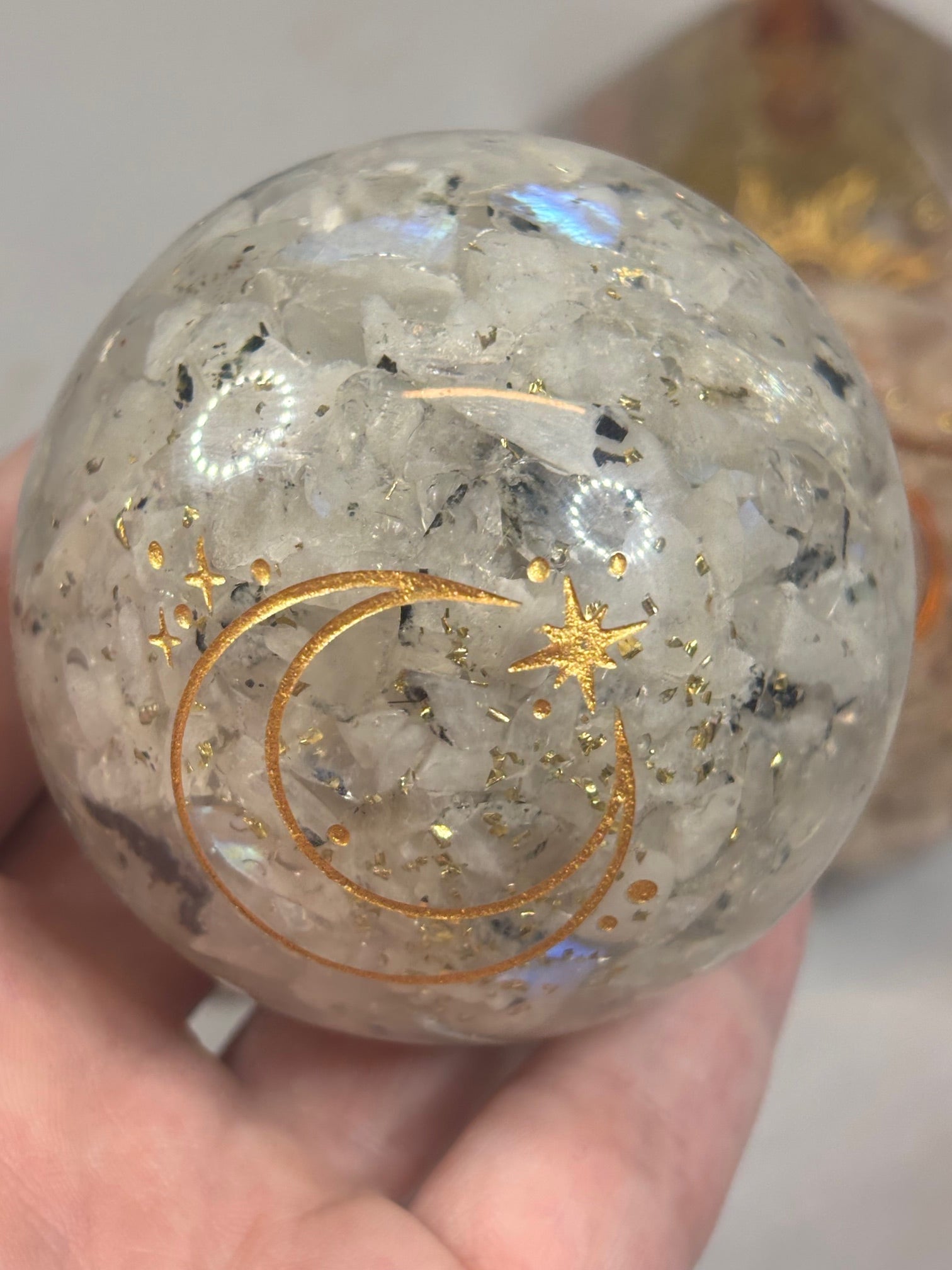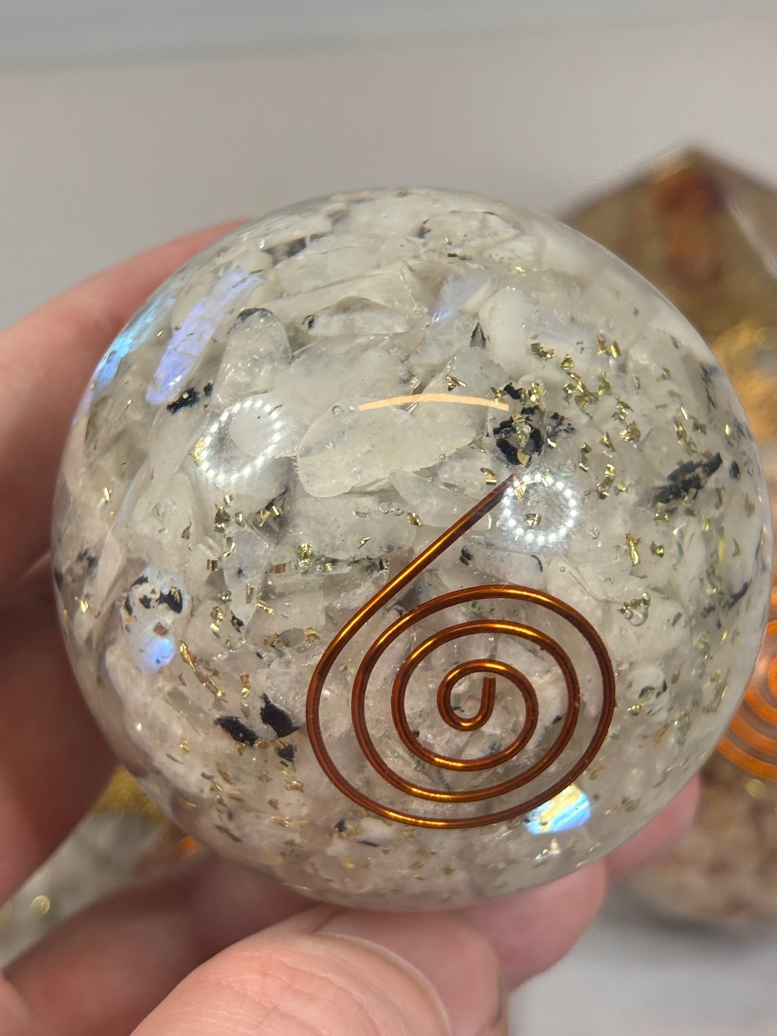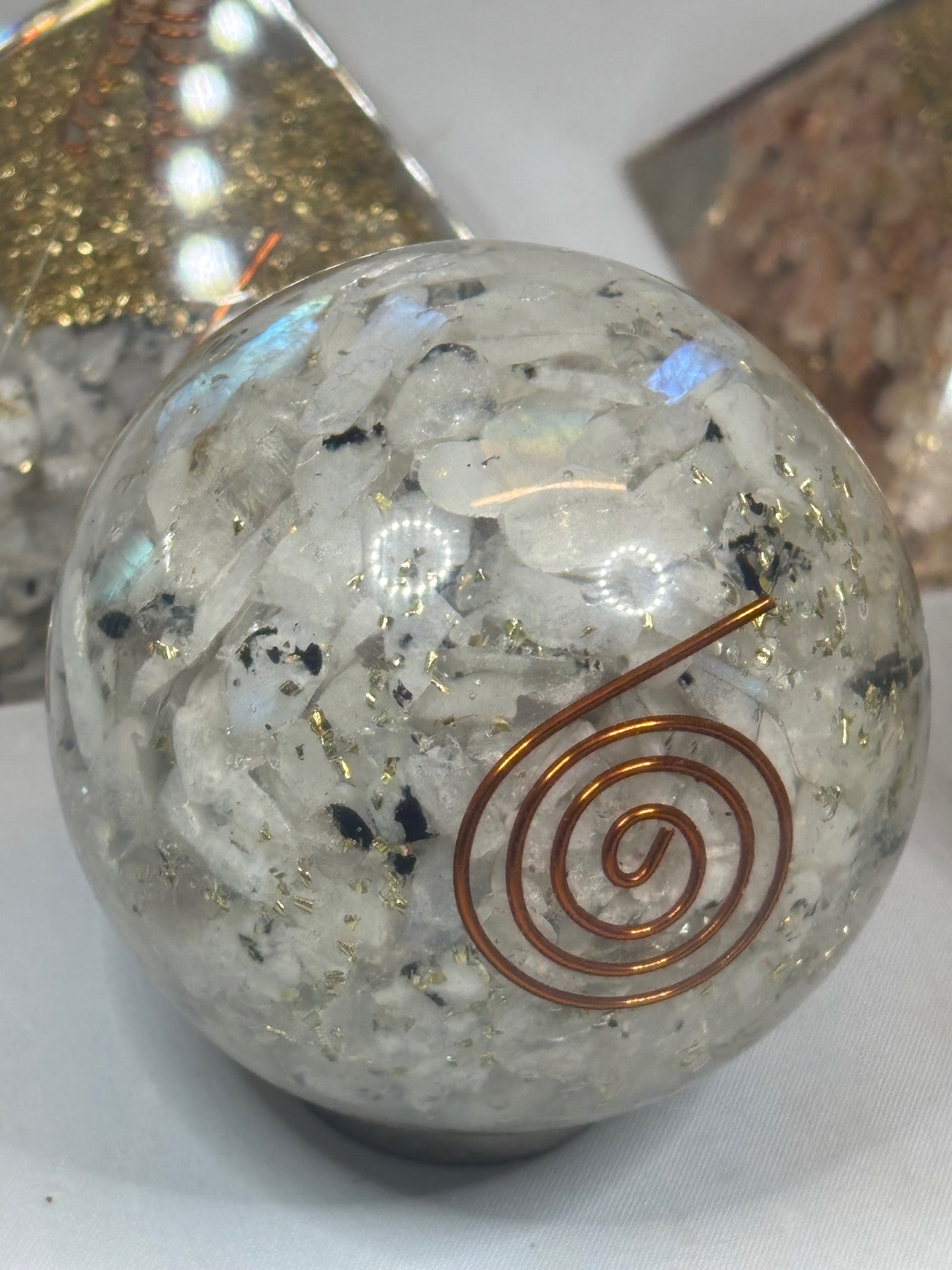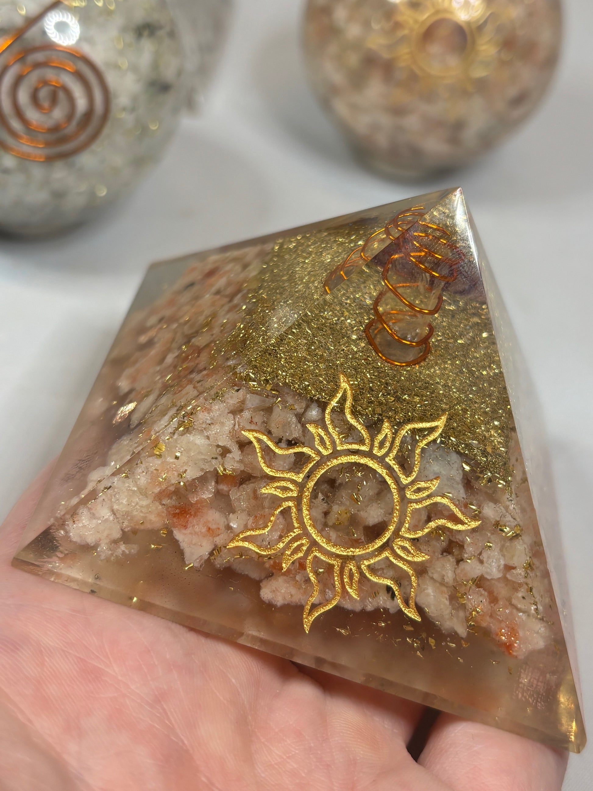 Wunderschöne hochglänzende Mondstein sowie Sonnenstein Orgonit Pyramide oder Kugel.