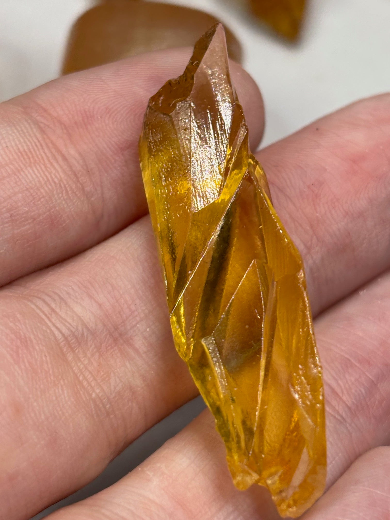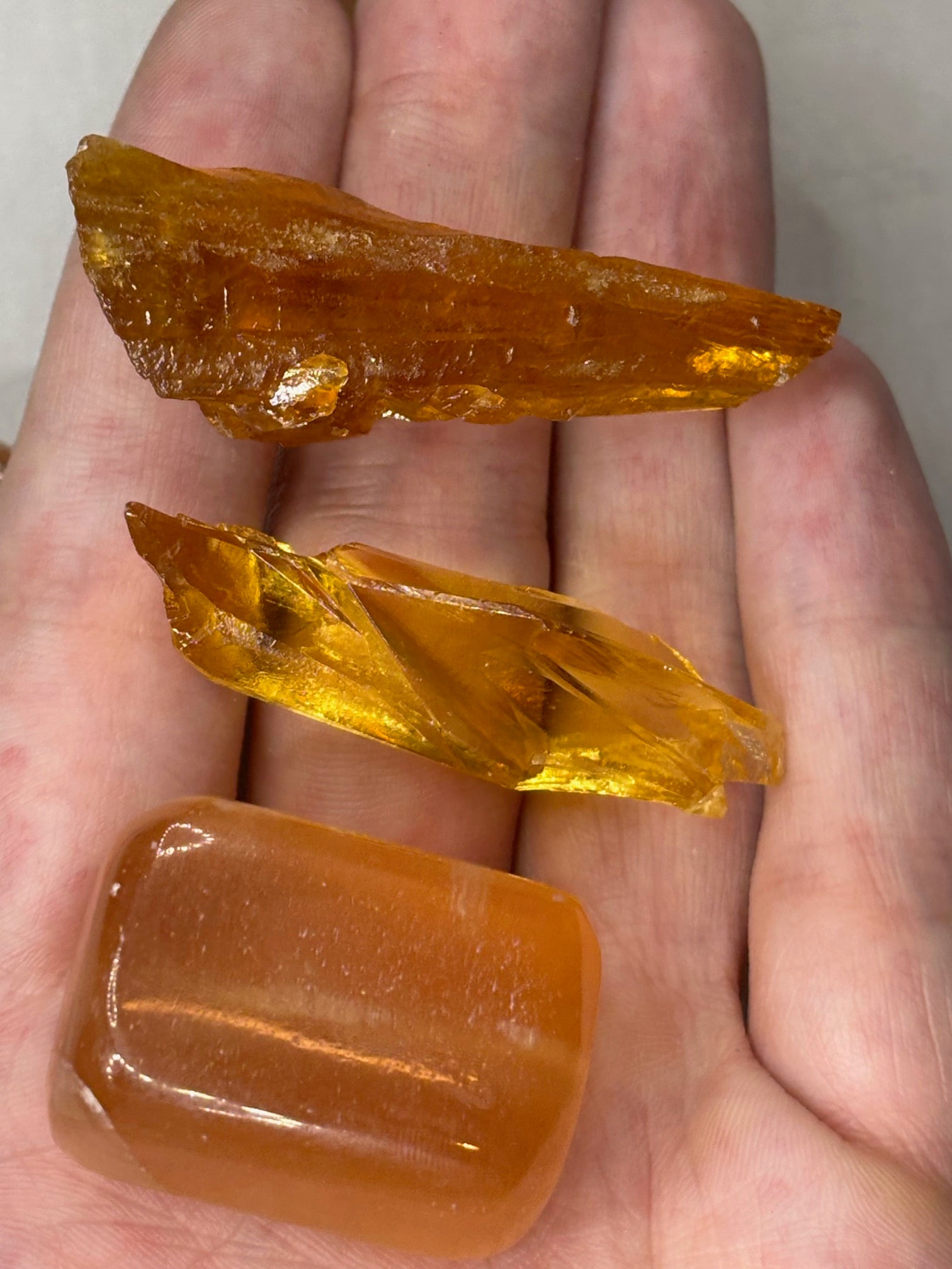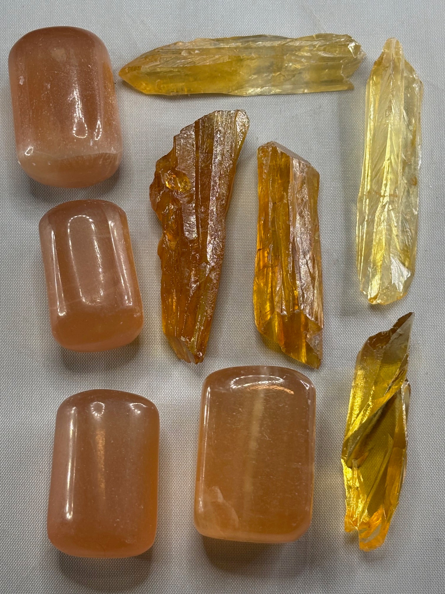 Außergewöhnlich schöne transparente Orangencalcit entweder als naturbelassener Kristall oder als Trommelstein alle mit sehr intensiver Färbung.