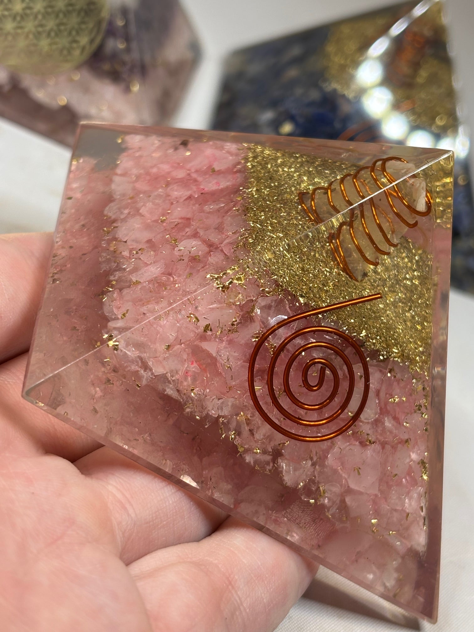 Wunderschöne Rosenquarz oder blaue Sodalith oder goldenes Dreieck Orgonit Pyramide, hergestellt im goldenen Schnitt, dem selben Verhältnis wie die ägyptische Cheops Pyramide, also 14:11
