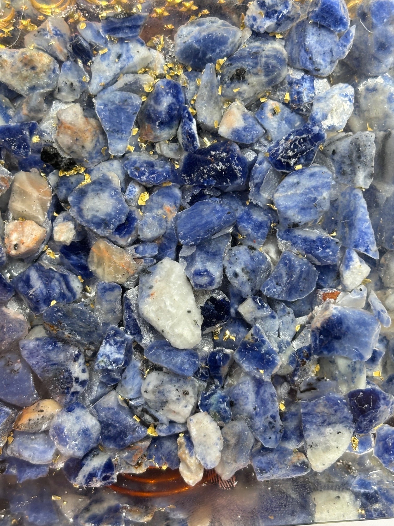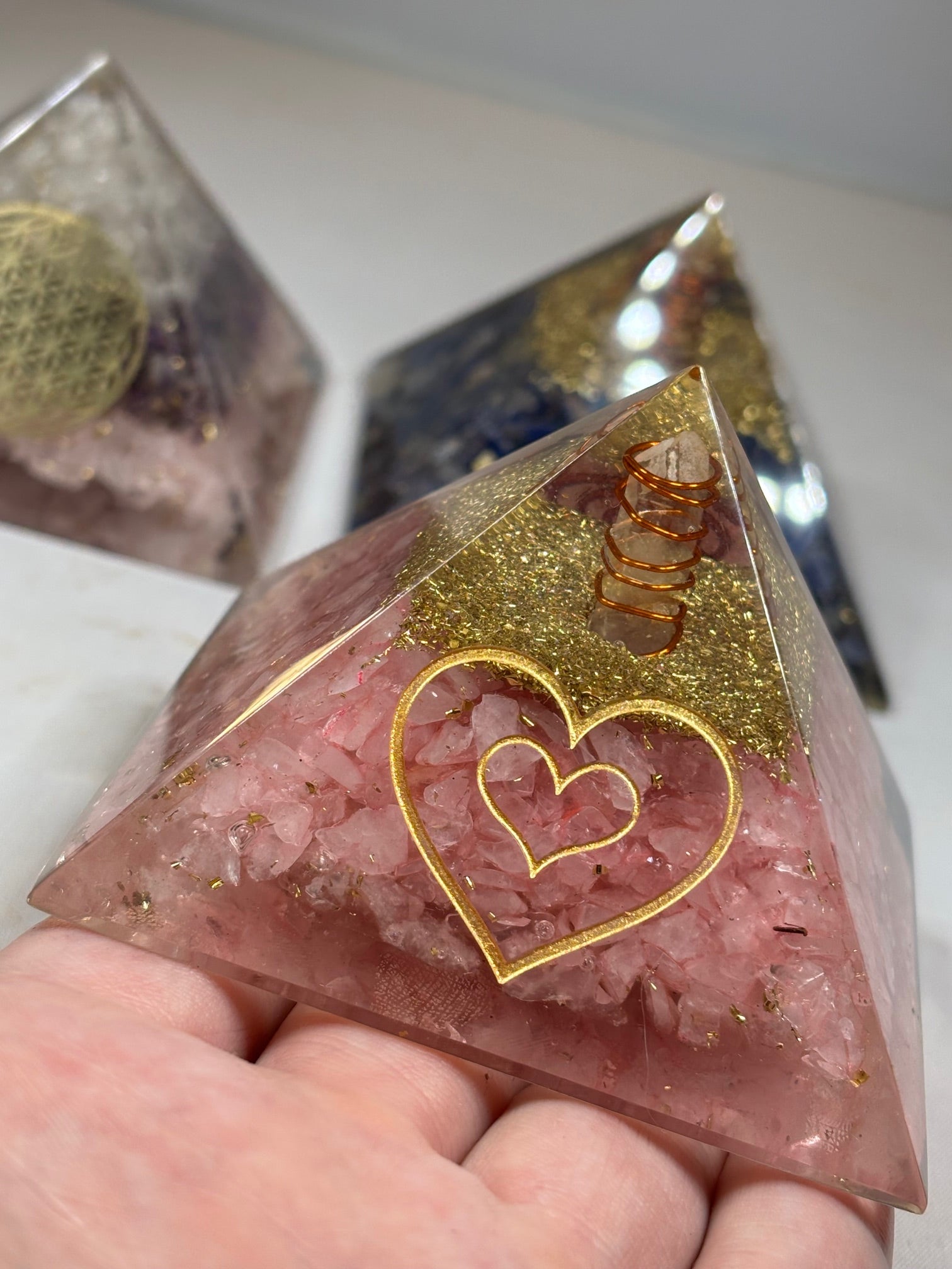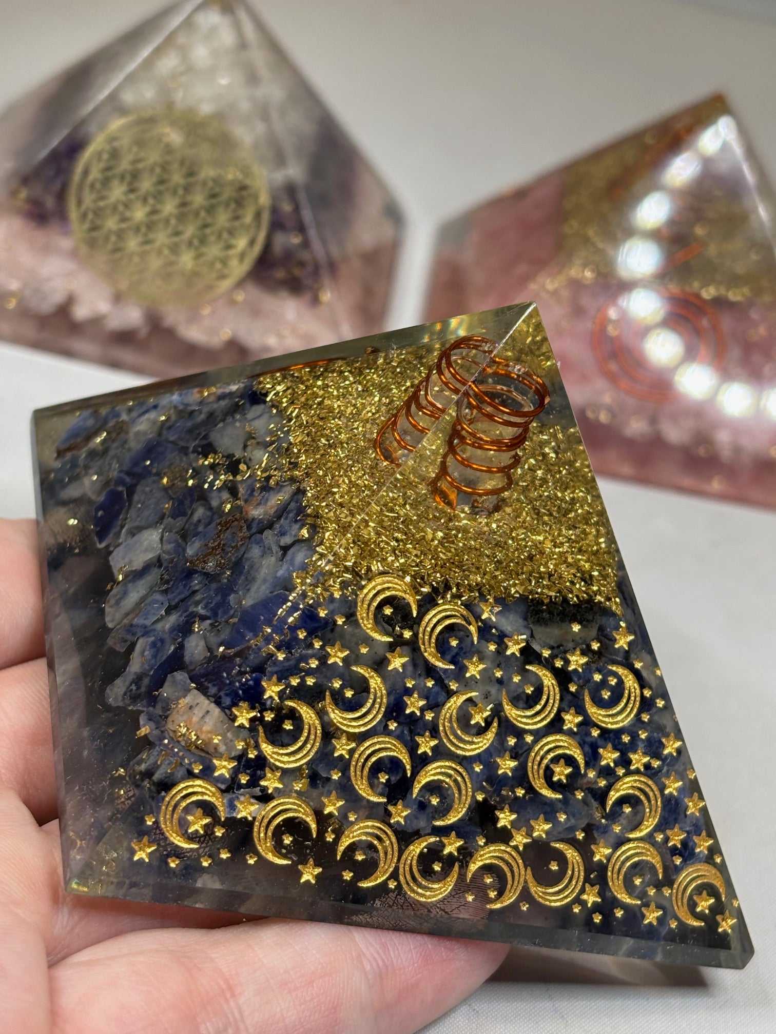 Orgonit Pyramide, Rosenquarz, Sodalith & goldenes Dreieck (Amethyst+ Bergkristall+ Rosenquarz) Orgonit Wilhelm Reich