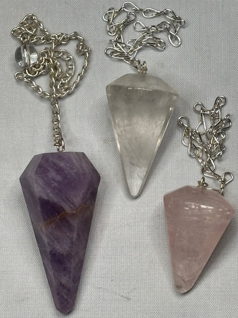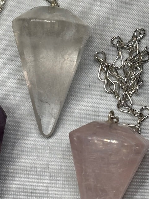 Entweder sehr transparentes Bergkristall Heilsteinpendel oder intensiv farbene Amethyst sowie Rosenquarz. Die Amethyst Pendel haben zusätzlich eine kleine transparente Bergkristall Kugel.