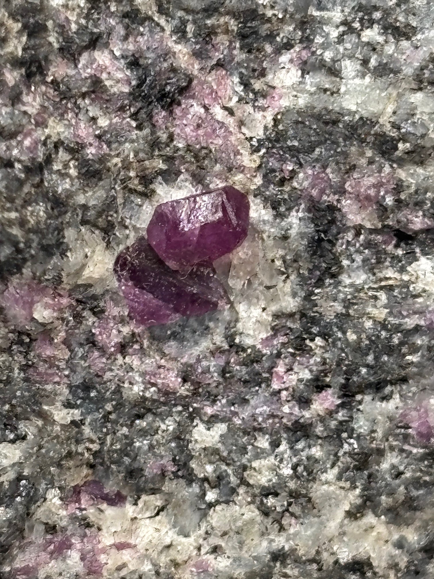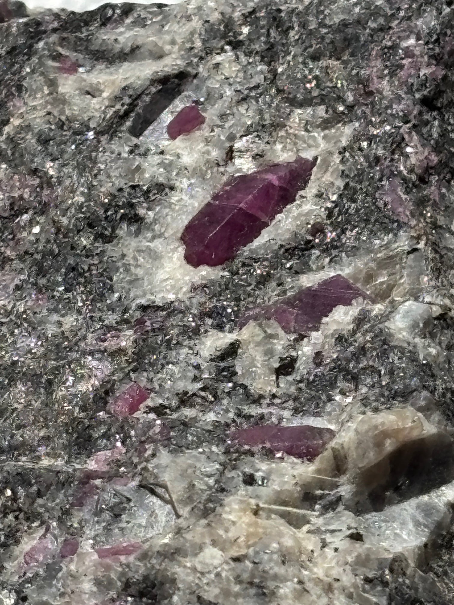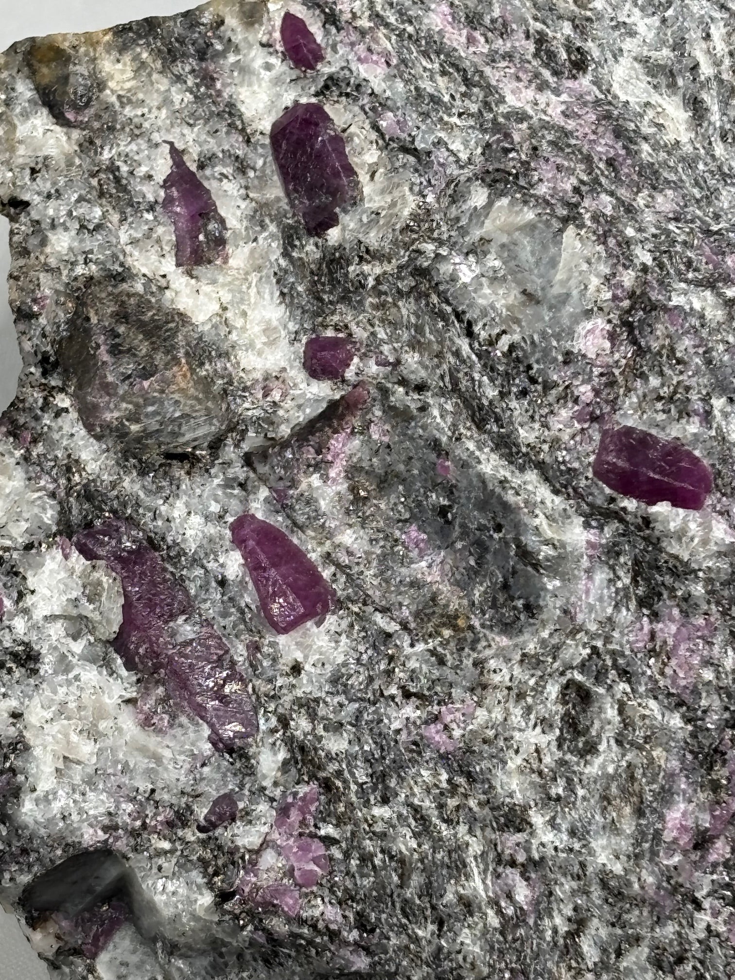 Wunderschöne farbintensive & teilweise sogar sehr transparente Rubin Kristalle in hochglitzernder Matrix welche aus Korund, Biotit, Feldspat & Quarz besteht.