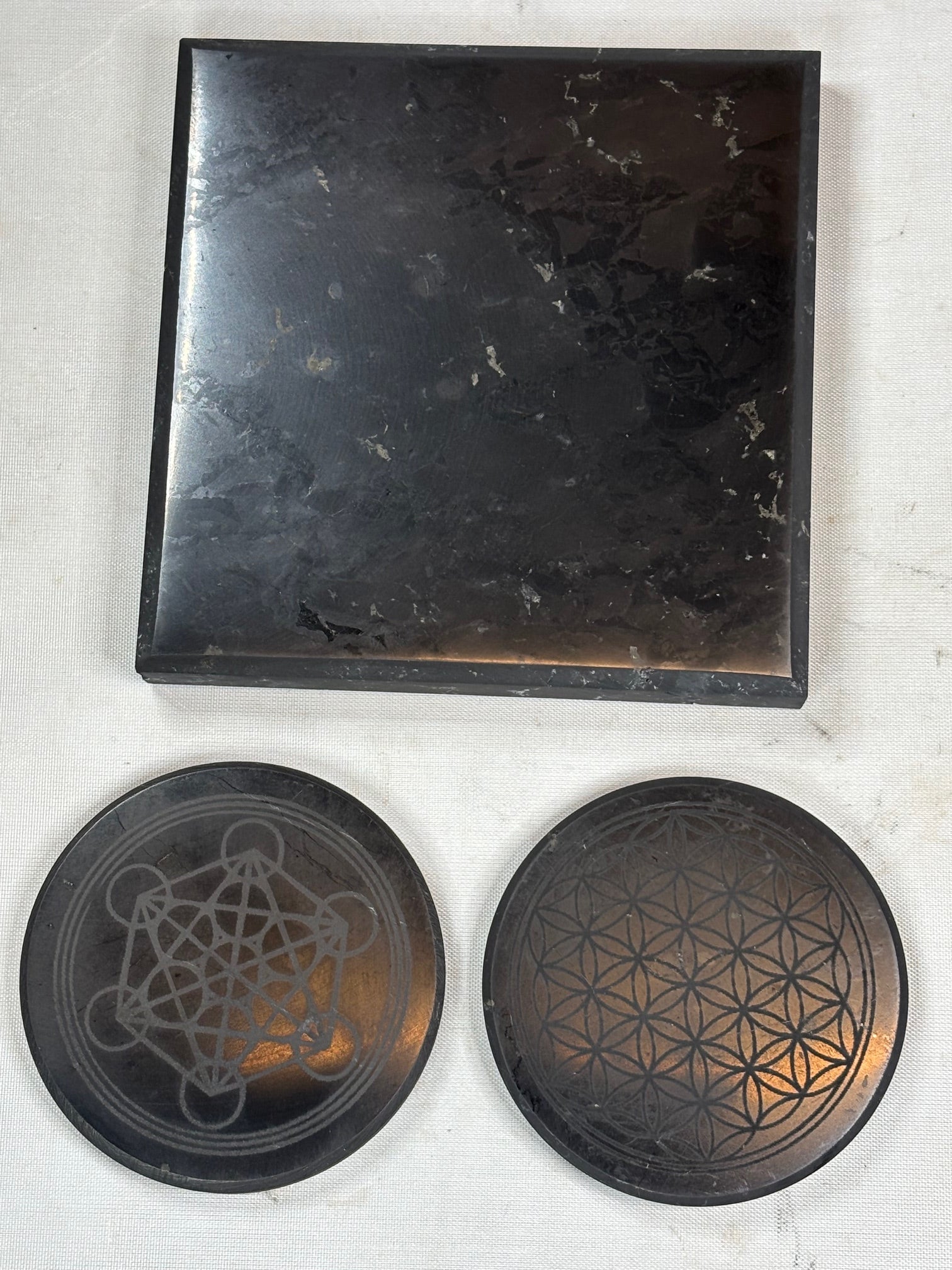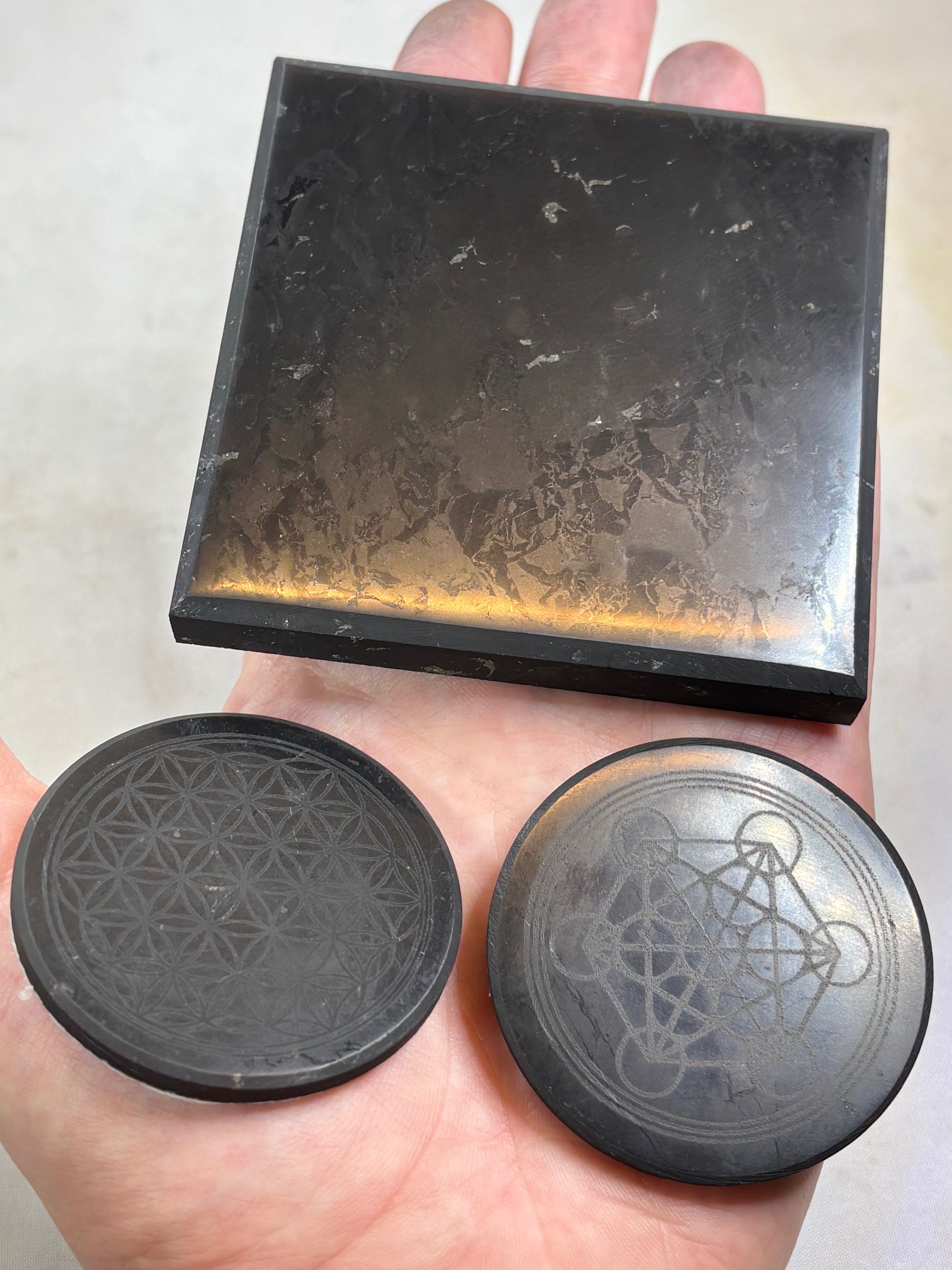 Diese hochwertigen Schungit Ladeplatten vereinen die kraftvolle Energie des natürlichen Shungite (Schungit) mit den uralten Symbolen der Metatron's Cube oder der Blume des Lebens.