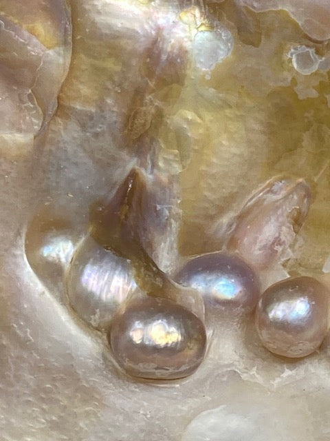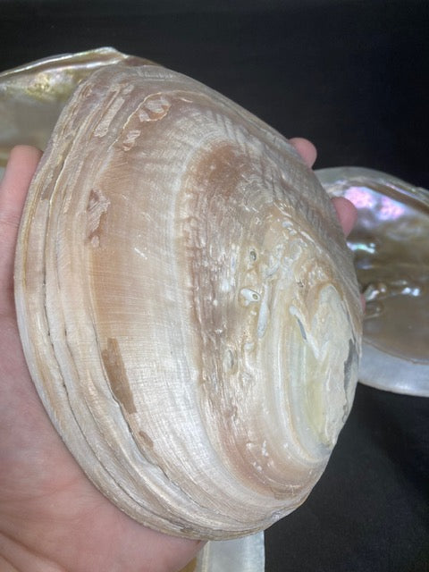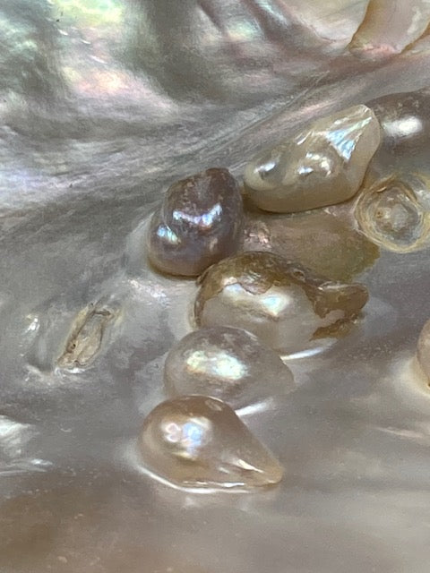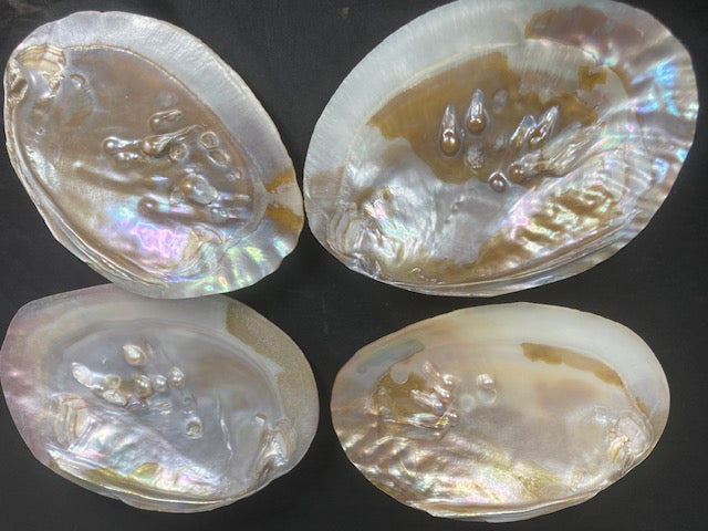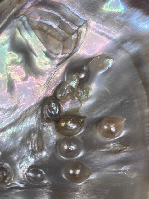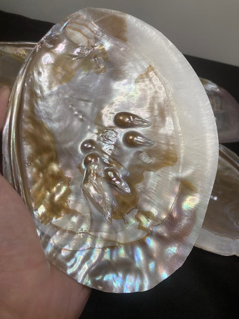 Wunderschöne extra große Muschel mit sehr viel in regenbogenfarben schimmernden Perlmutt & eingewachsenen Perlen, beste Qualität.