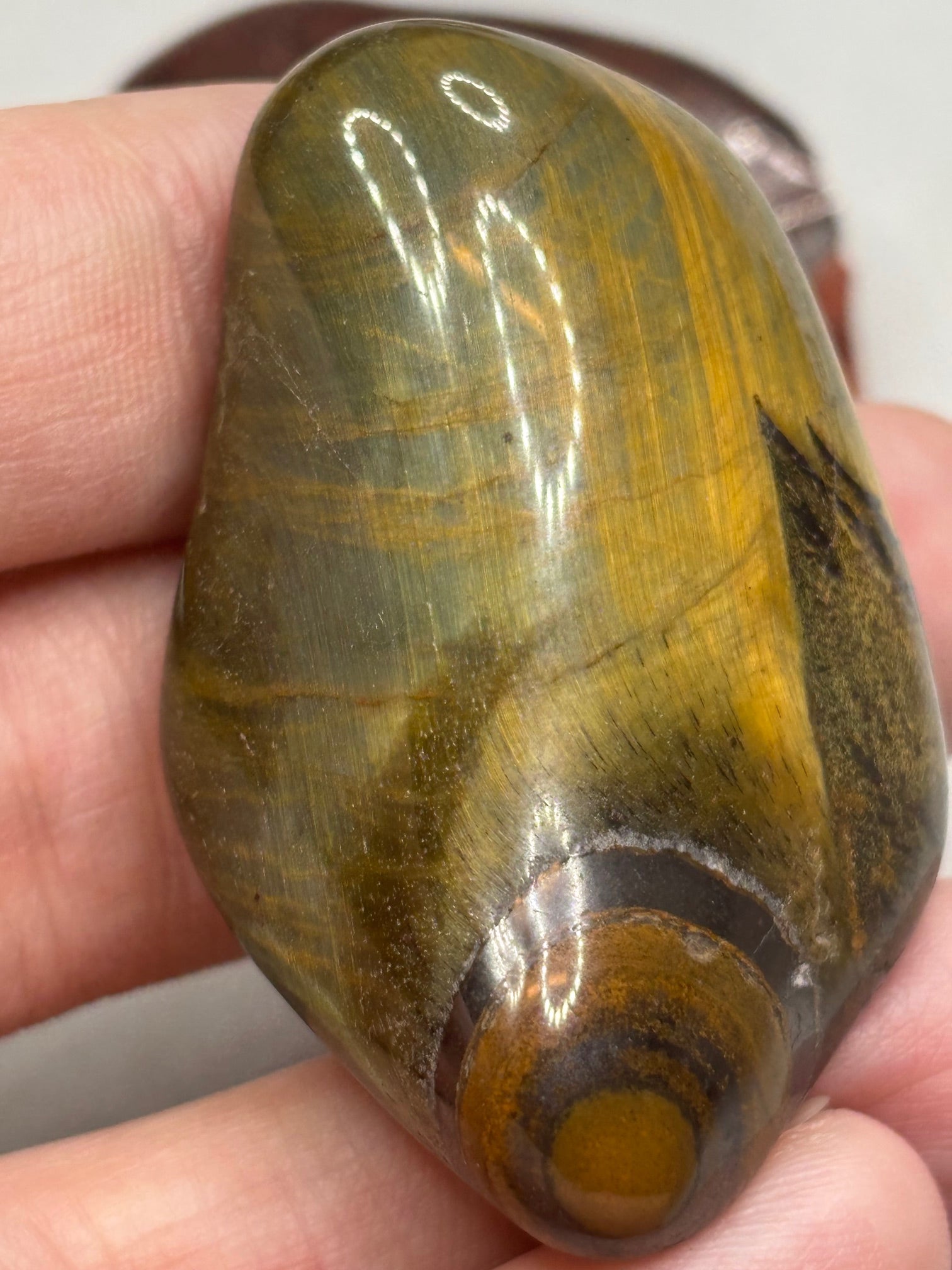 Wunderschöne Tigerauge Trommelsteine in den Farben gelb, rot oder blau mit intensivem Katzenaugeneffekt. (Chatoyanz)