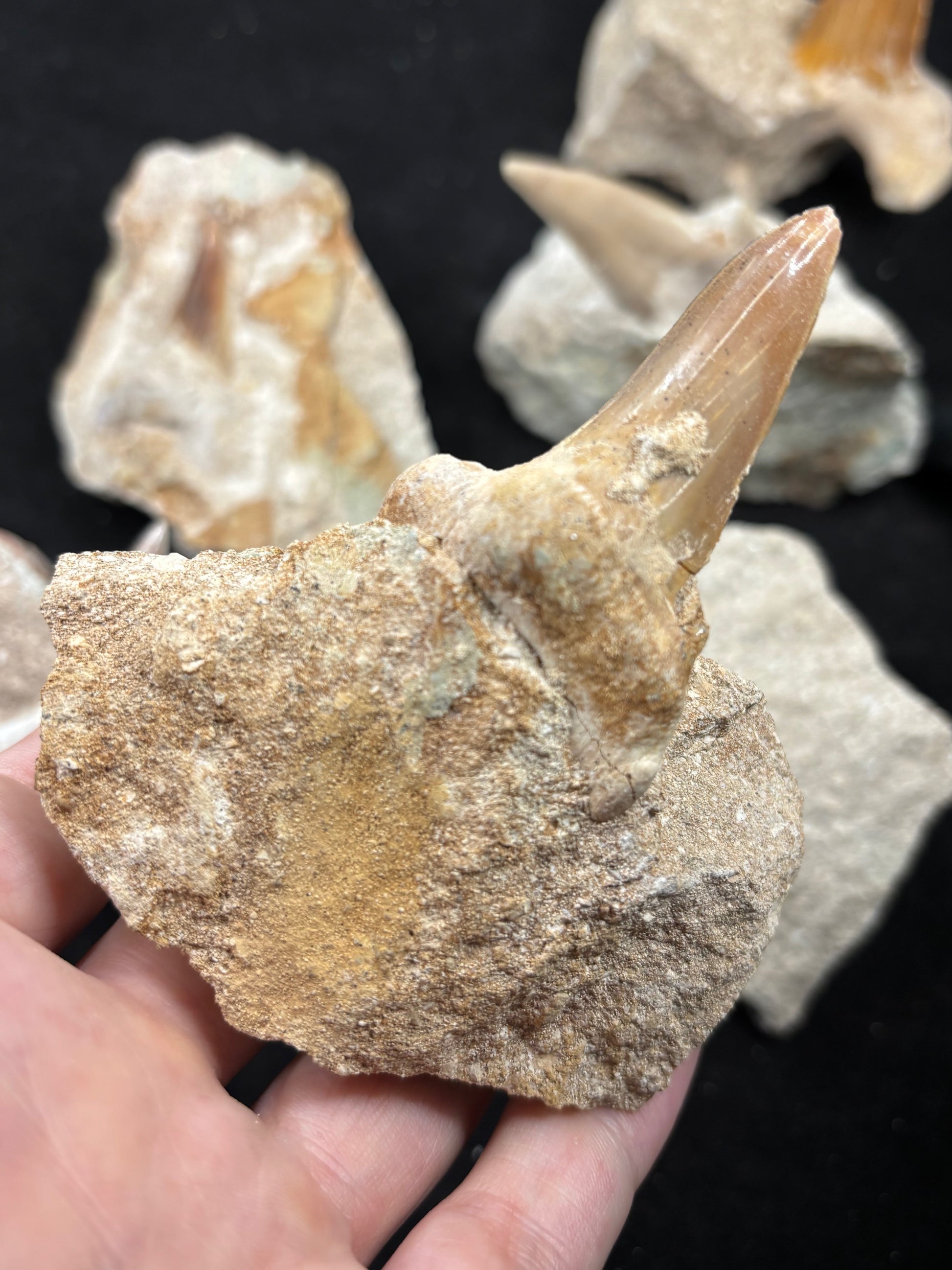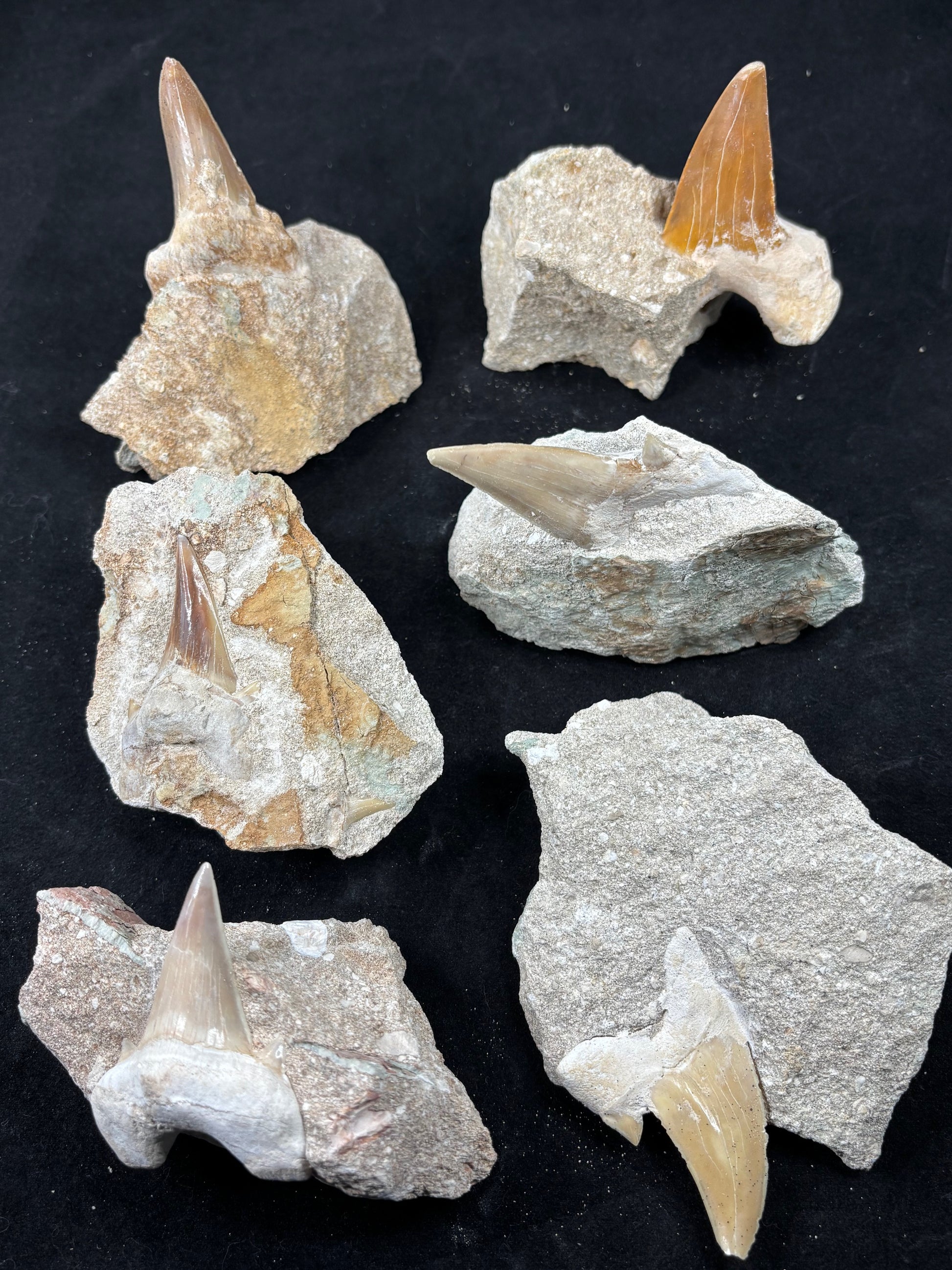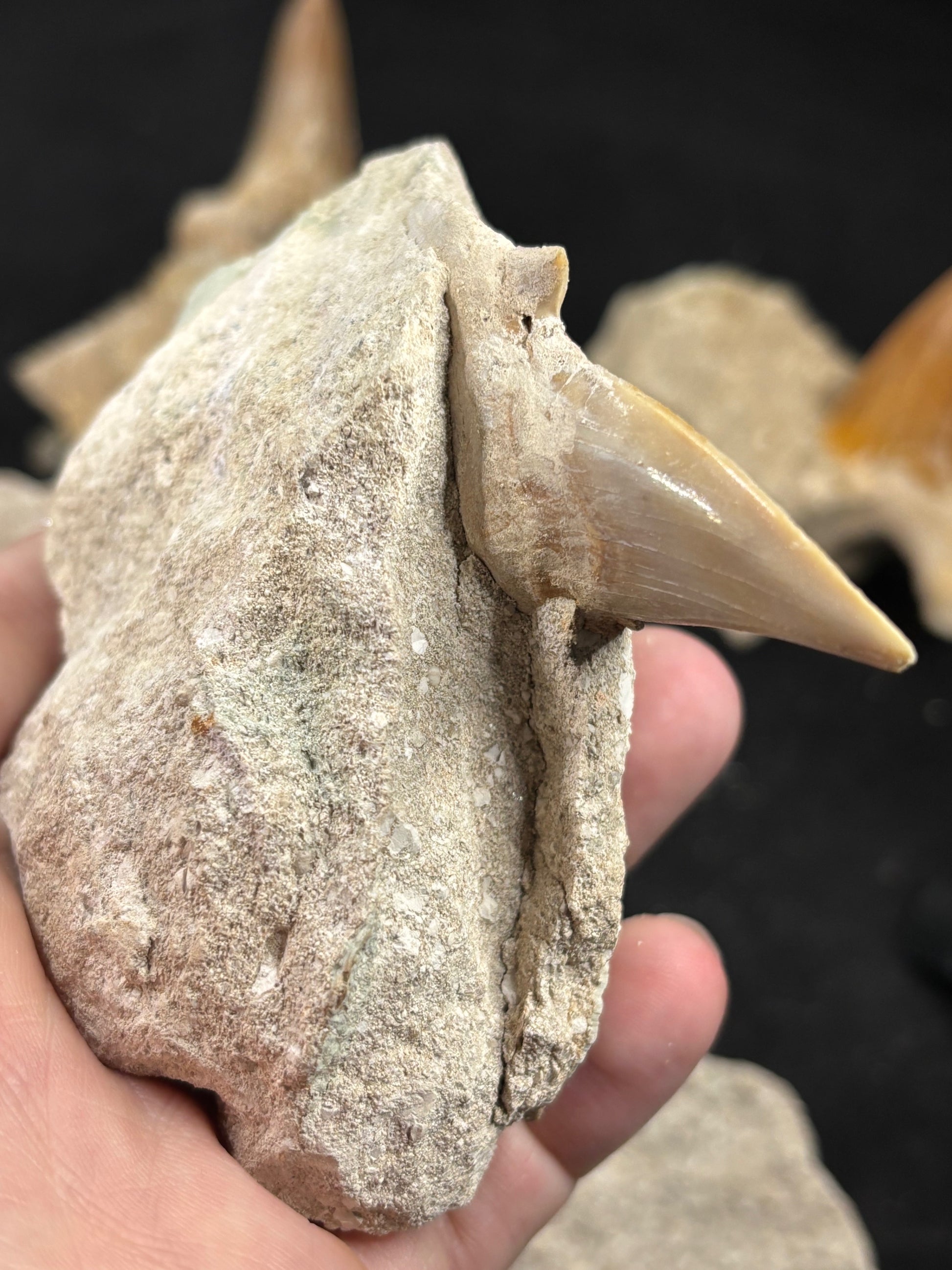 Die größten Haizähne aus Marokko, stammen vom "Schreckenshai"Gattung Otodus obliquus, seine Zähne bestechen durch die außergewöhnlich gute Erhaltung & die sehr schöne Färbung.