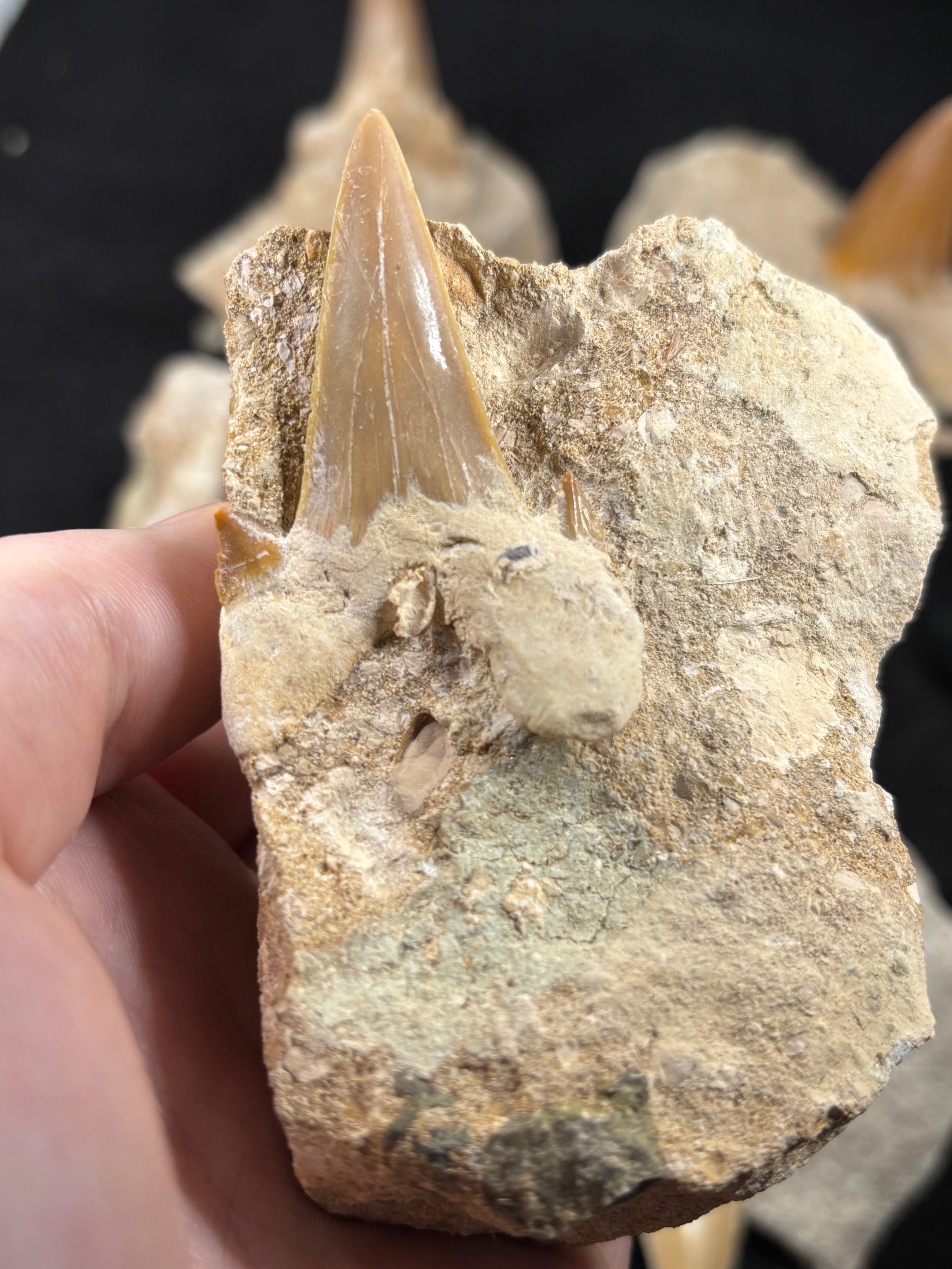 Völlig naturbelassener sehr dekorativer XL fossiler Haizahn in Matrix, jedes Stück ist ein Unikat.