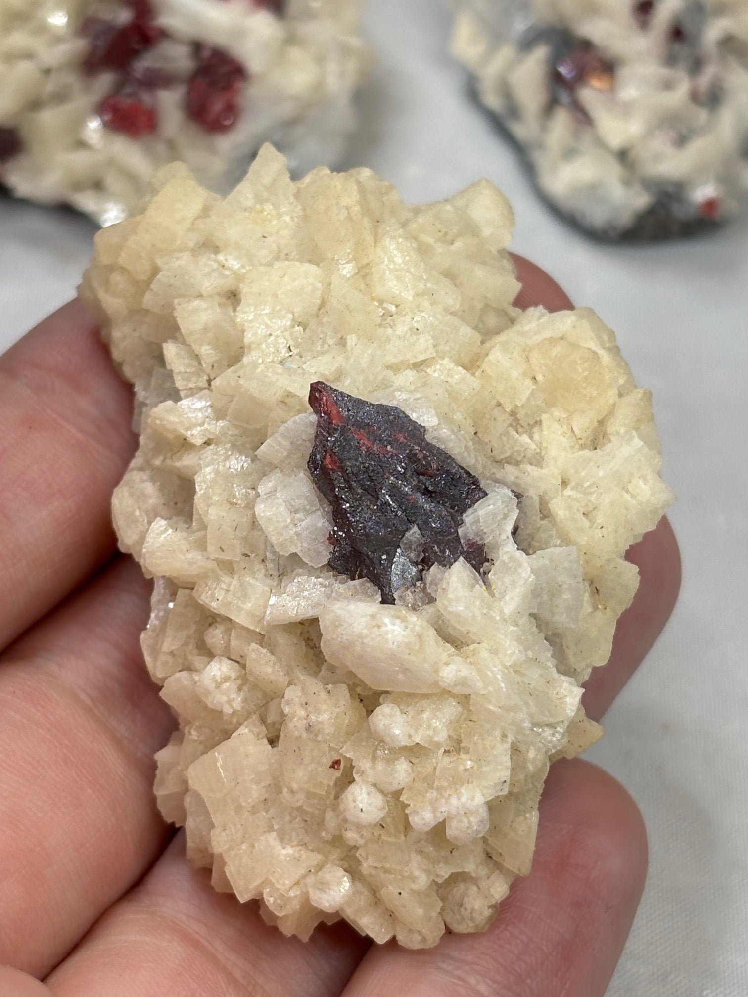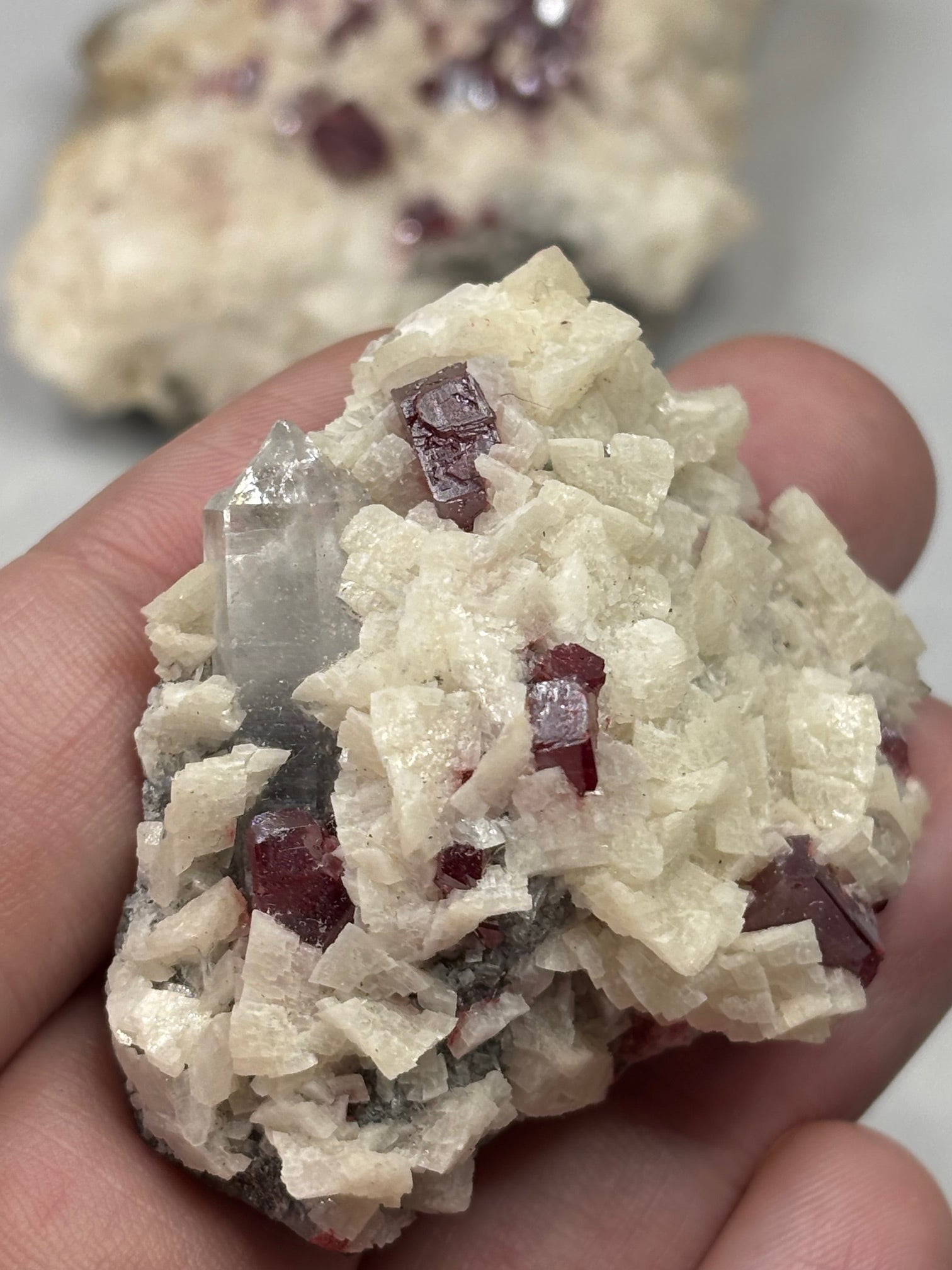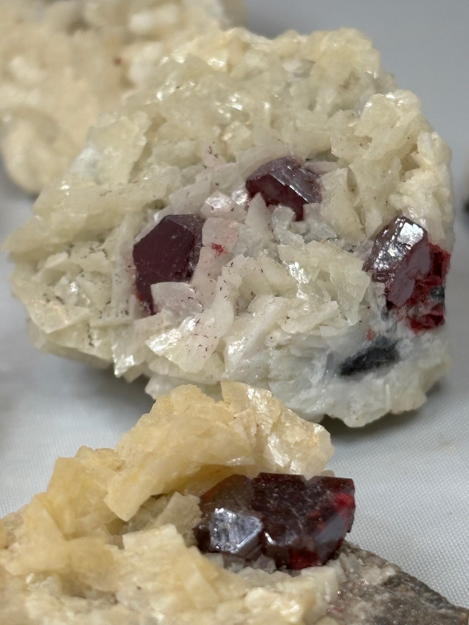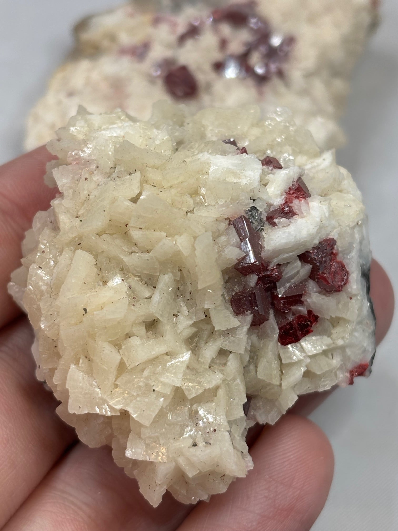 Wunderschöne völlig naturbelassene sehr transparente Zinnober Kristalle, mit der typisch roten Farbe, auf weißen Dolomit Kristallen hochglänzend & in bester Qualität.